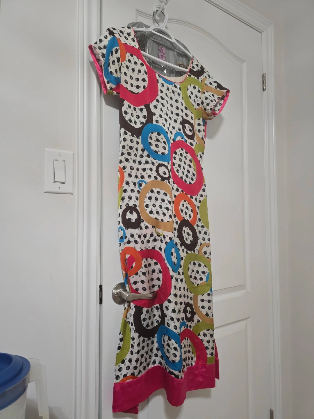 10Here's a dress with a fun and colourful pattern! It features circles and polka dots on a white background, with pink trim. It's in great condition and ready for a new home