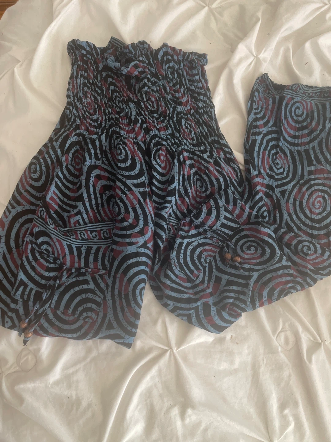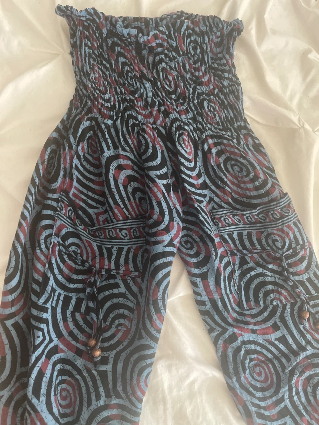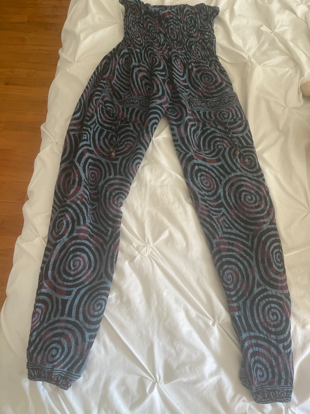 Comfortable and stylish harem pants with a unique spiral pattern in shades of blue, black, and burgundy. These pants are perfect for lounging or adding a bohemian touch to your outfit! They feature a smocked elastic waistband and drawstring ankles for a flexible fit