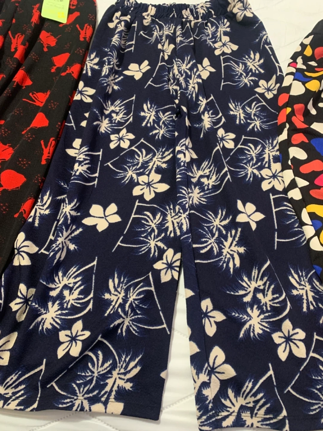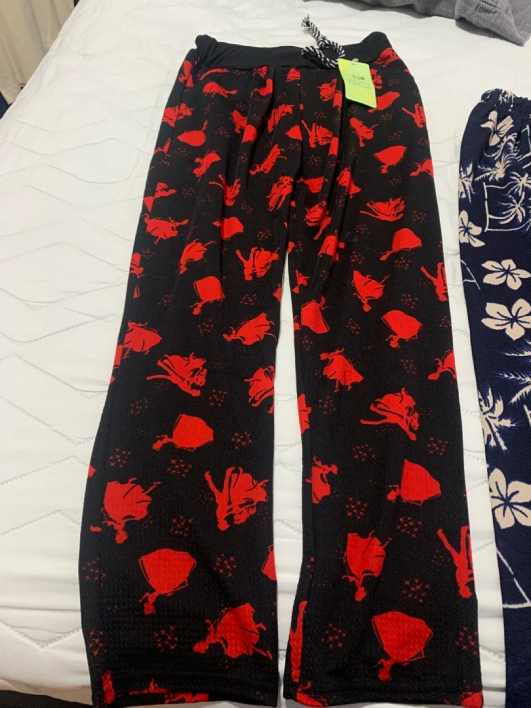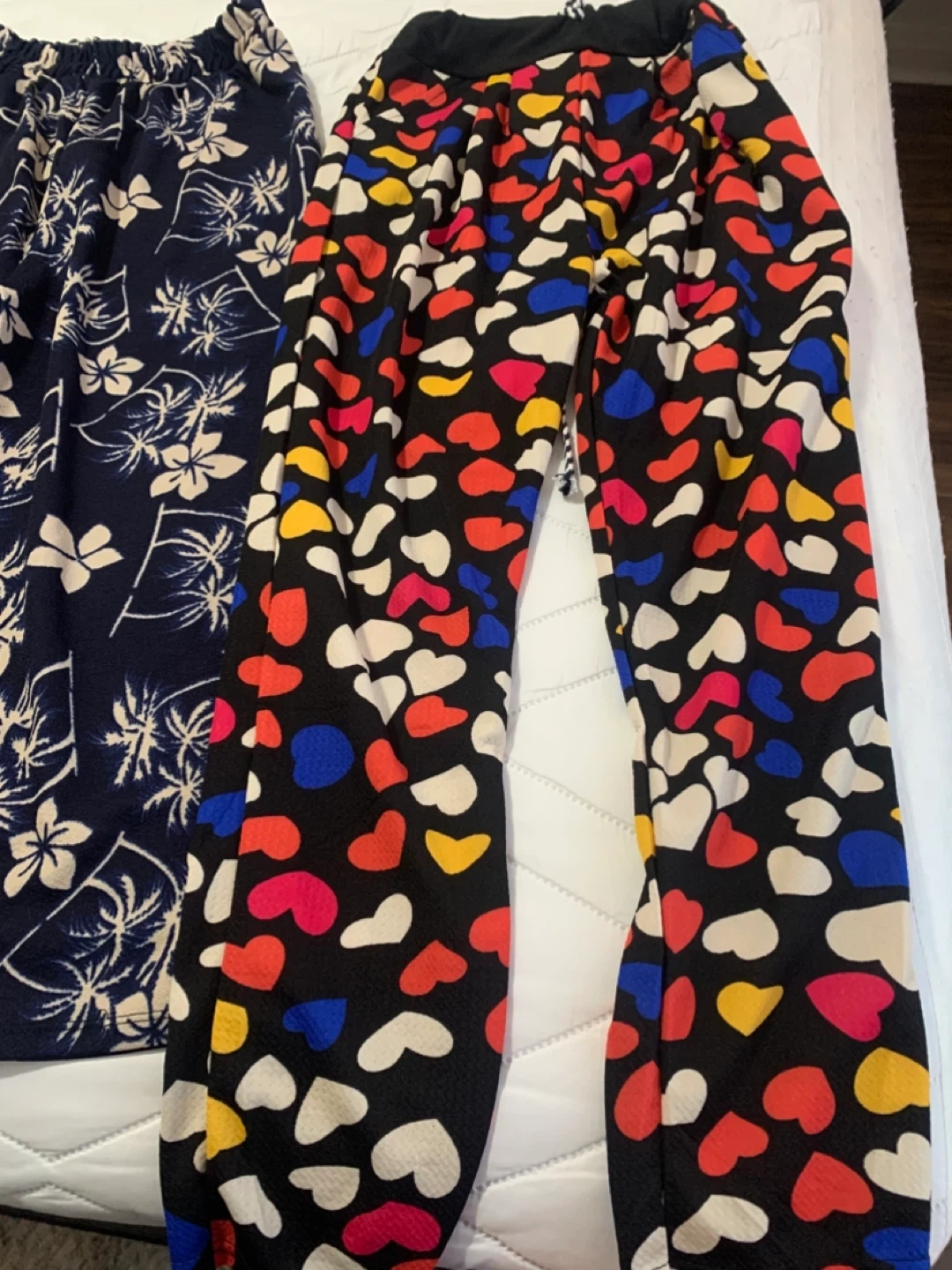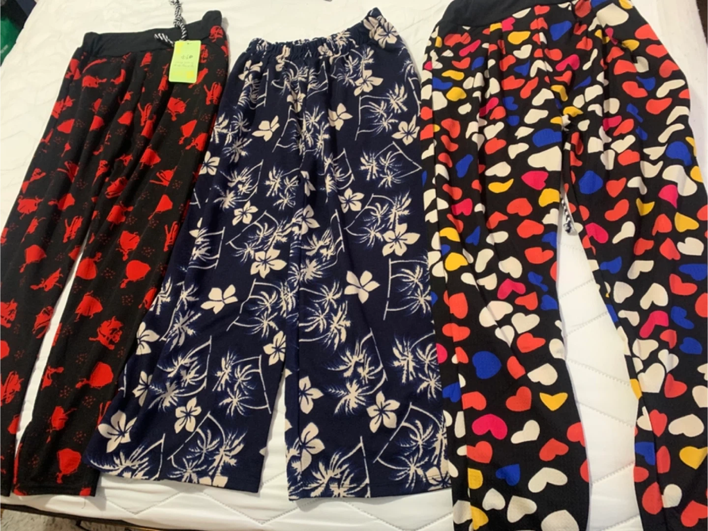 Selling a set of three patterned lounge pants. One pair is black with red figures, another is navy with white flowers, and the third is black with colourful hearts. They're super comfy and perfect for relaxing at home!
