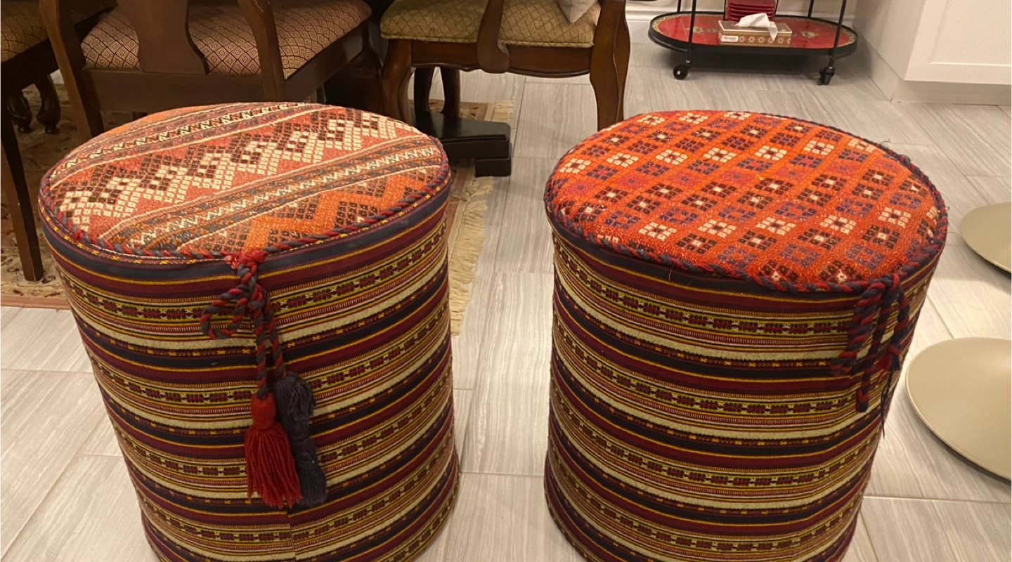 Two charming ottoman footstools with a unique patterned design! They're in great shape and would add a touch of global style to any room. Perfect for resting your feet or as extra seating, each $100