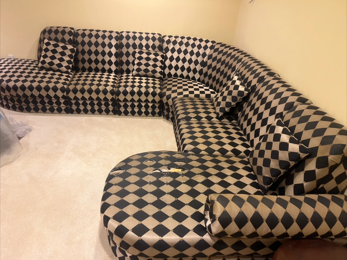 15Selling a sectional sofa with a unique diamond pattern. Please note there are some signs of wear and tear, as shown in the photos. It's still a very comfortable and stylish piece of furniture that could add a lot of character to your living space. Perfect for a large room or basement!