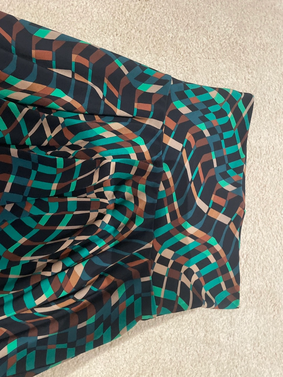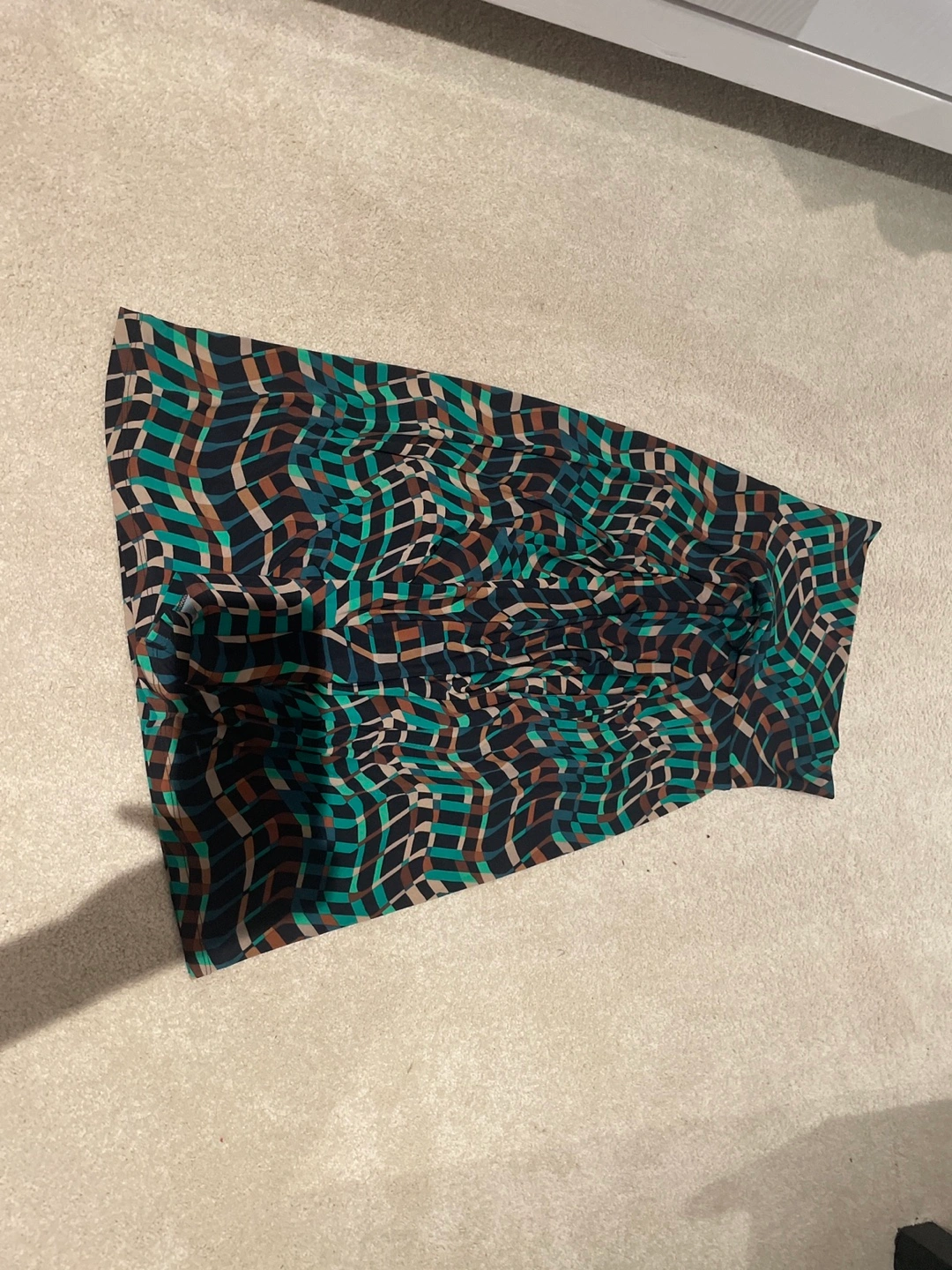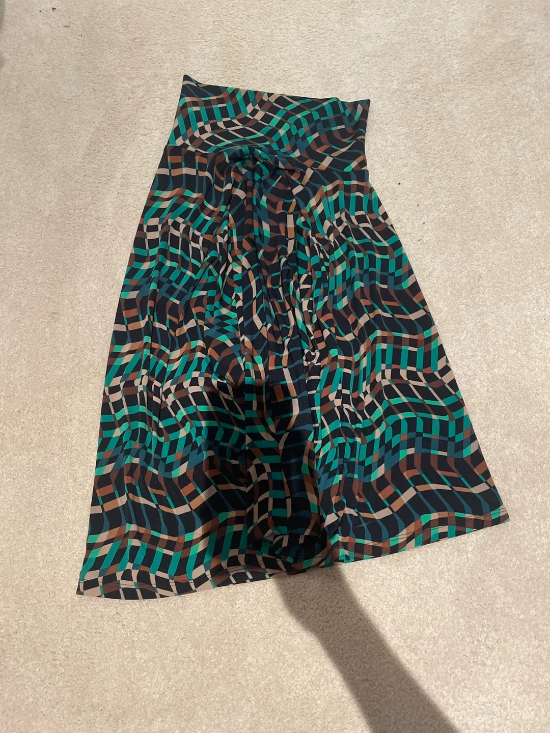 Here's a skirt with a unique geometric pattern in shades of teal, brown, and black. It's in great condition and ready for a new home!