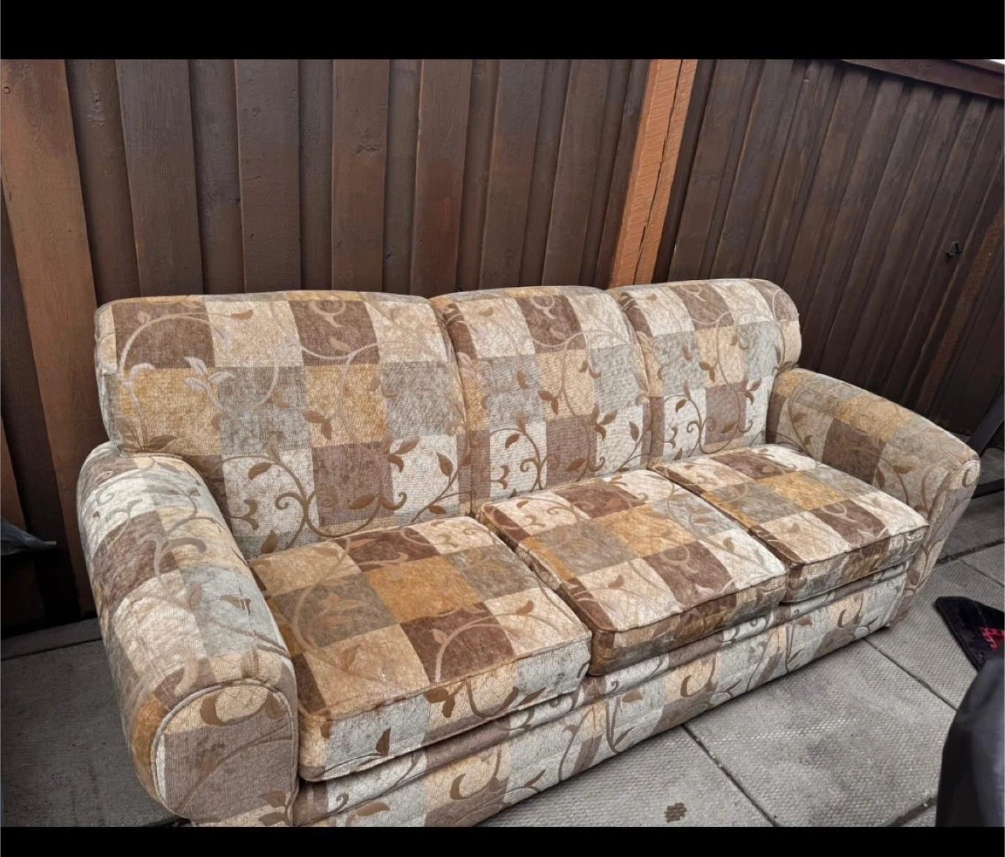 10Selling a comfortable three-seat sofa with a unique patterned design! It's in good condition and ready to add a touch of style to your living space. The sofa features a mix of earth-tone colours in a patchwork style with a floral pattern. Perfect for a cozy living room or den. Price is negotiable