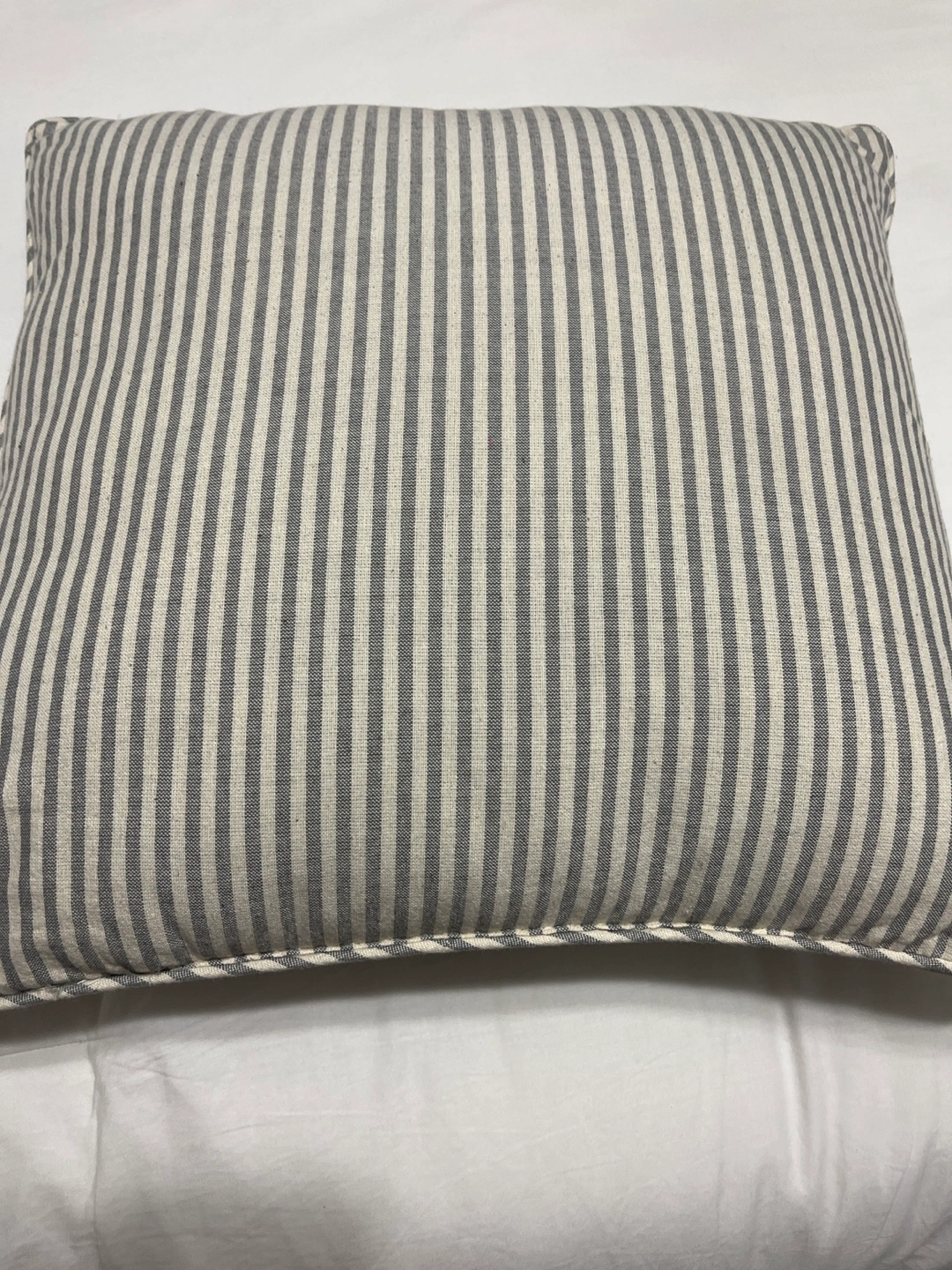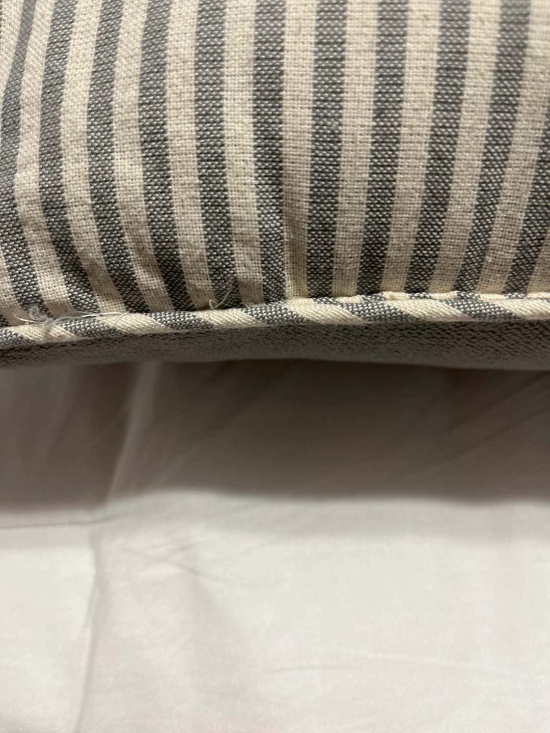 Gray striped pillow with white embroidered lettering that reads "Beyond Blessed". Delivery not available from 11-4 to 11-18