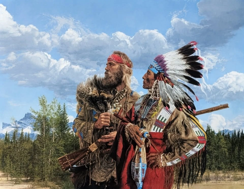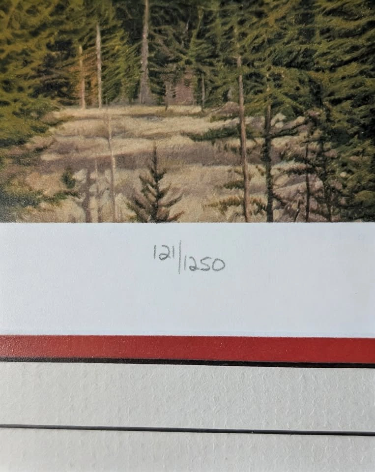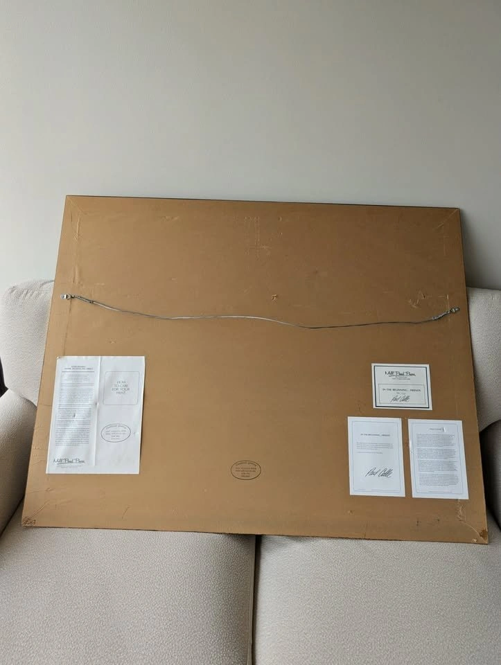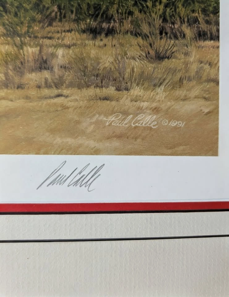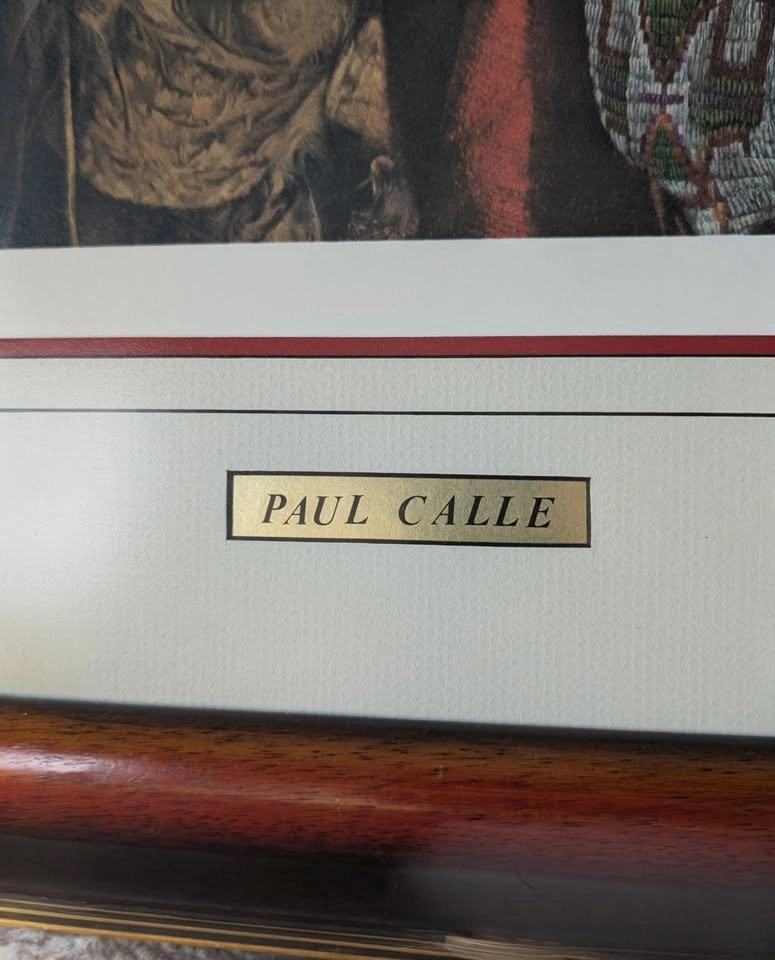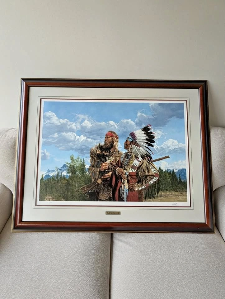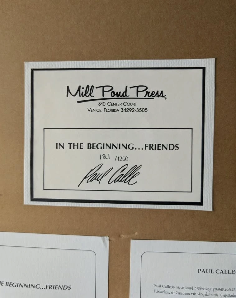 Collector-grade Paul Calle limited edition from Mill Pond Press. • Title: In the Beginning… Friends (1991) • Medium: Paper lithograph — hand-signed in pencil and numbered 121/1250 • Publisher: Mill Pond Press (labels + certificate of authenticity on the back) • Subject: A mountain man and Indigenous leader in the Rockies — classic Western realism • Framed size: ~42" W × 33" H (ready to hang) Print size: ~30.5" W x 21" H • Condition: Artwork excellent; frame and mat present beautifully with only light, honest wear from age. Clean, smoke-free. Why this piece: Calle is known for meticulous Western scenes; this is one of his most recognizable images. Retail gallery asks for this print (unframed) are in the hundreds—this framed, signed/numbered edition is priced to move.