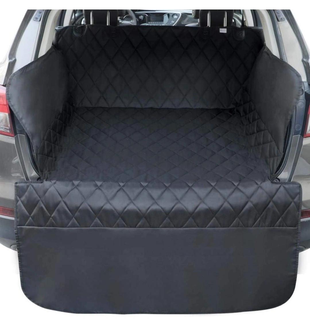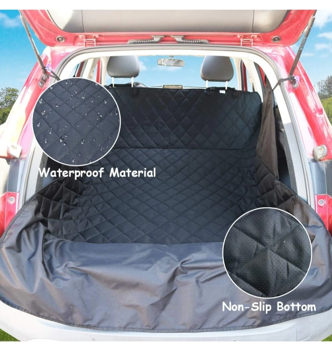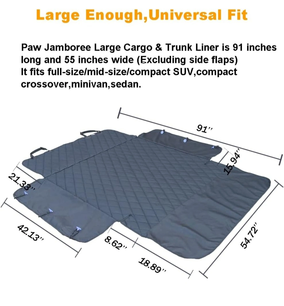 Waterproof car trunk liner. Non-slip bottom. Fits most vehicles. Includes side flaps and quick release buckles. Measures 91 inches long and 55 inches wide. Durable and easy to clean.