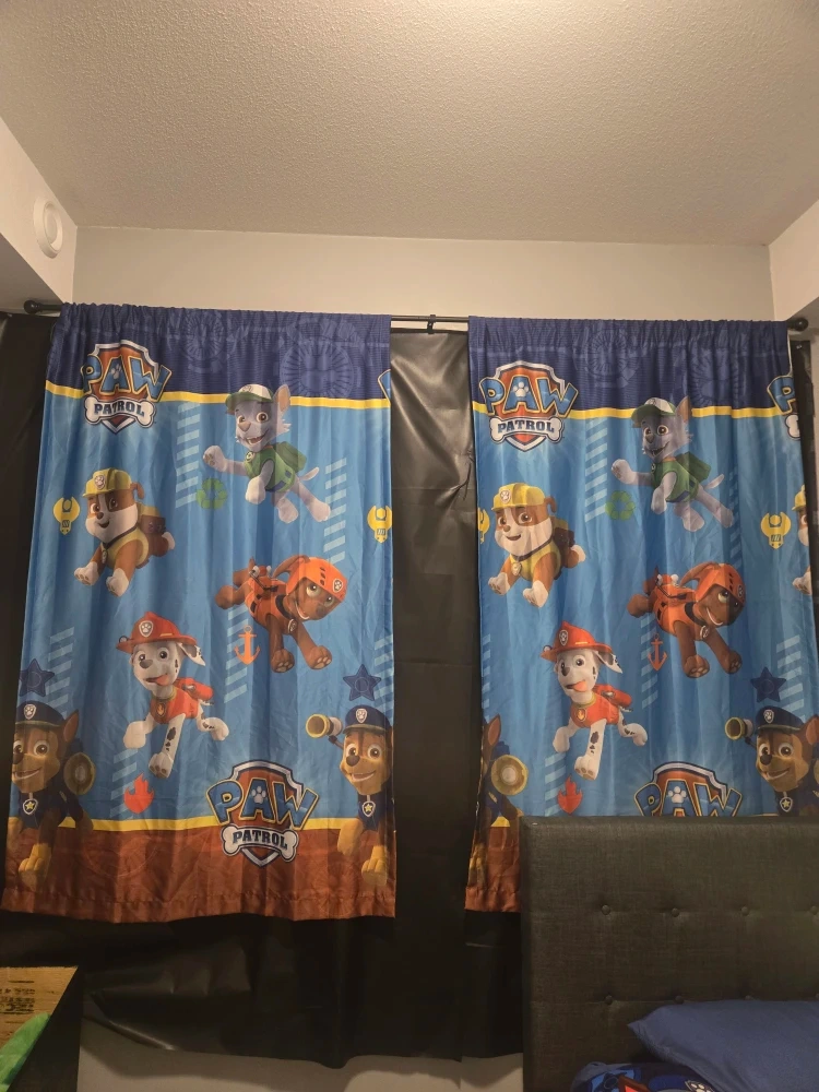 43These Paw Patrol curtains are perfect for a kid's room! They feature all the favourite characters and will add a fun pop of colour to any space 2 panels each panel is 41×65 * black underneath not included