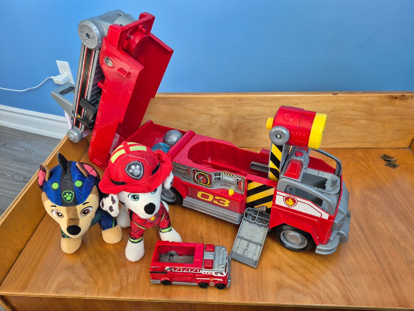 Paw Patrol Marshall's Transforming Fire Truck is ready for a new home! This fun toy features a ladder that extends and includes a mini fire cart. Perfect for kids who love Paw Patrol and imaginative play! Chase and Marshall stuffies