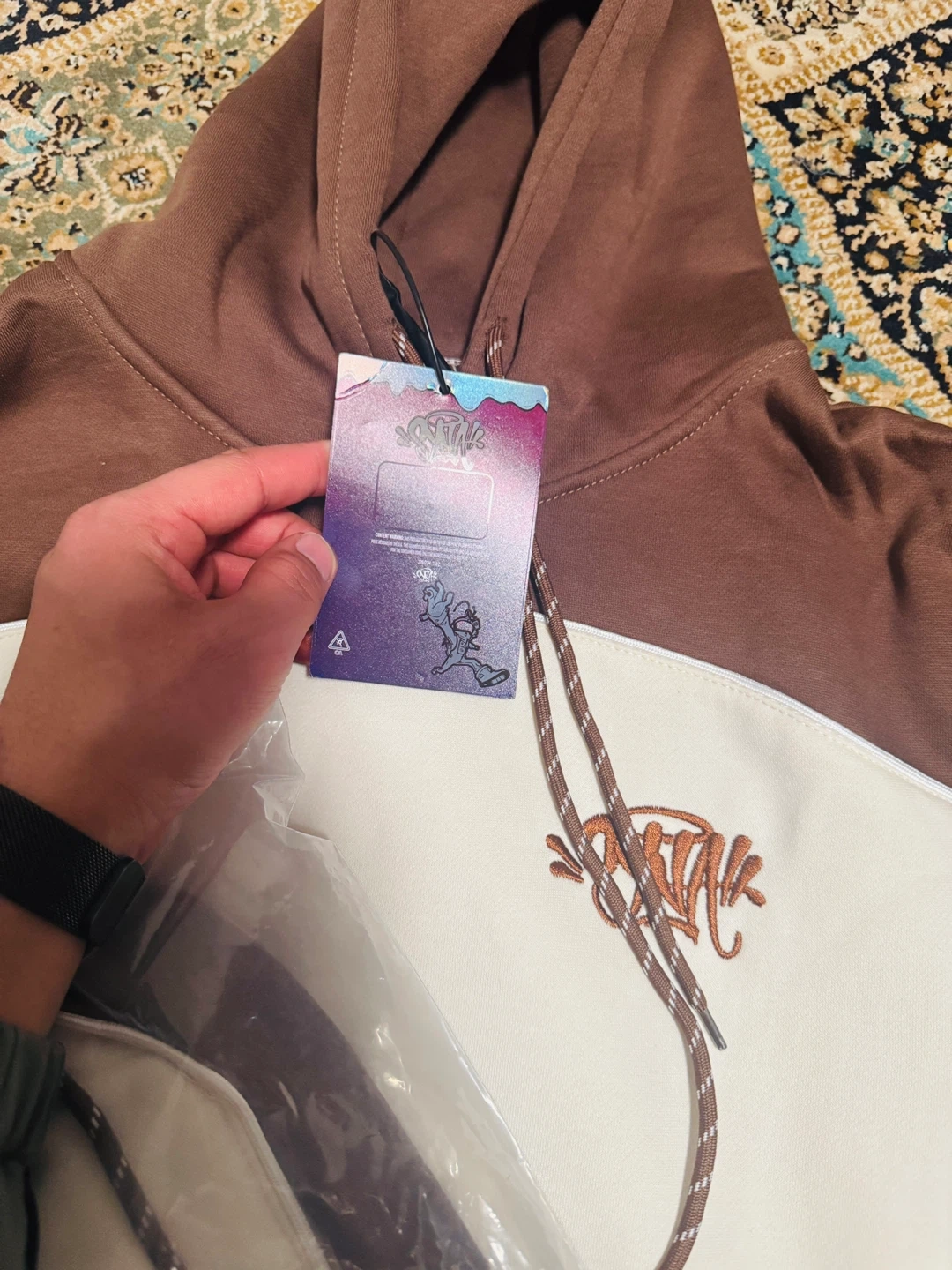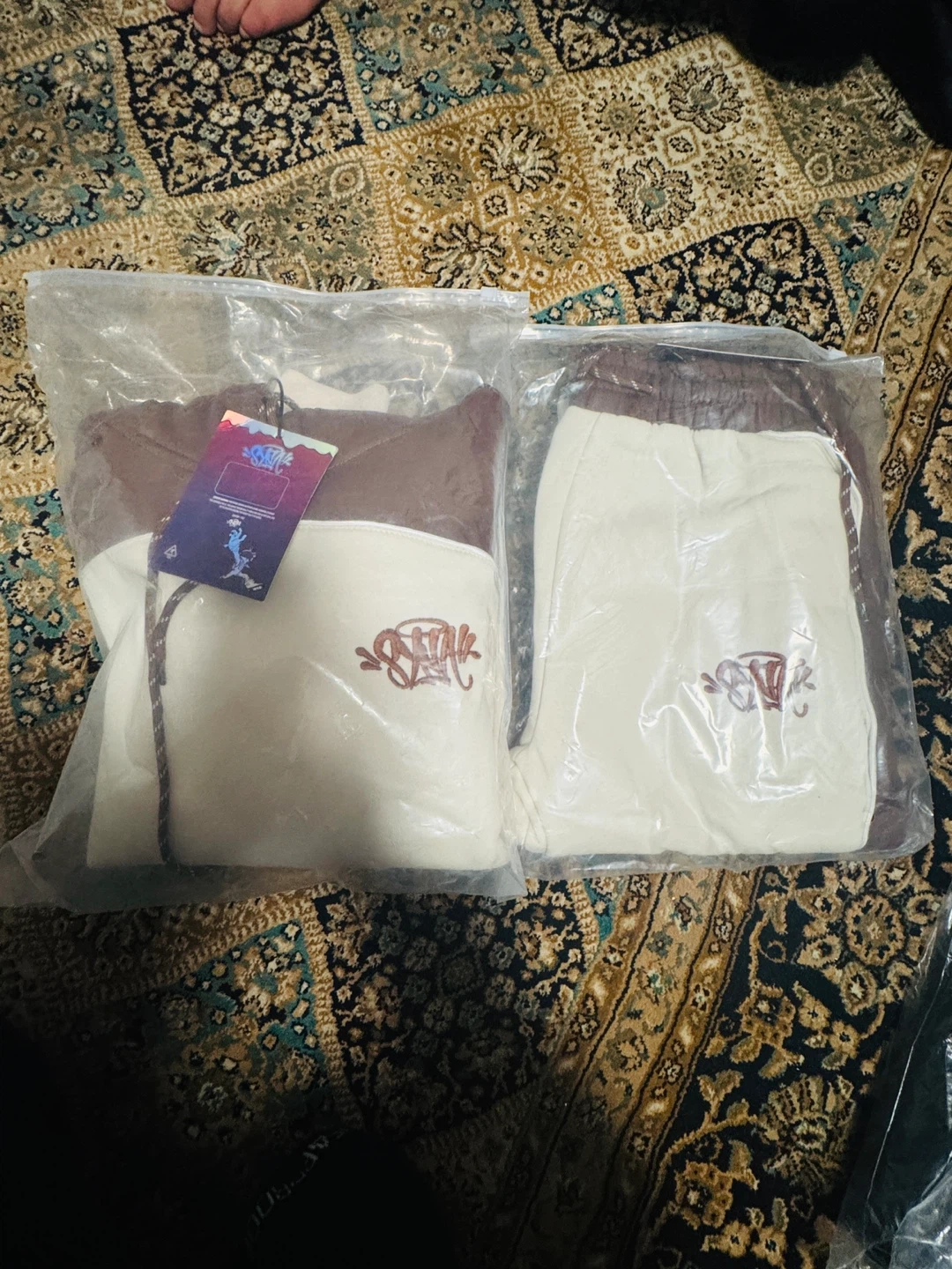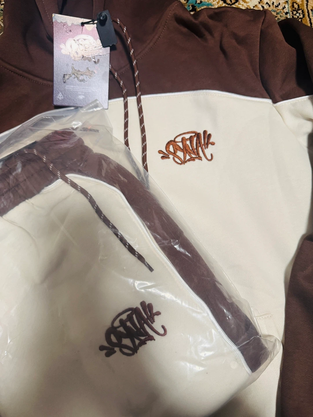 This set includes a colour-blocked hoodie and matching pants. Both pieces feature embroidered detailing. It's made for comfort and casual wear.