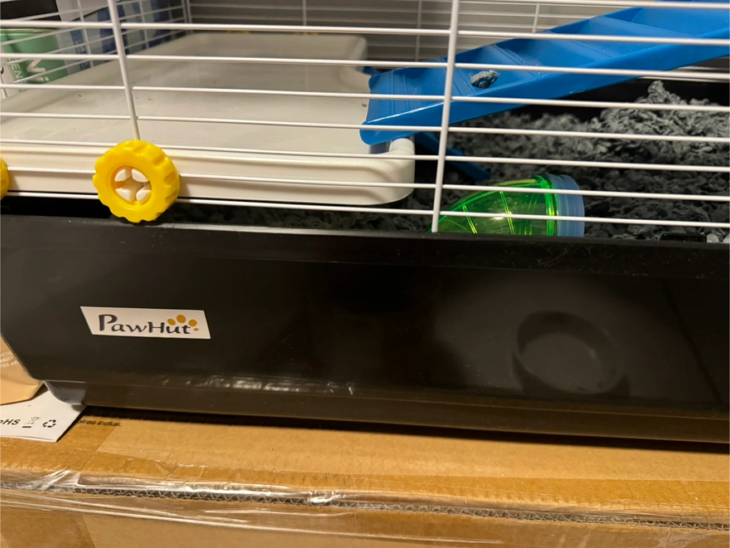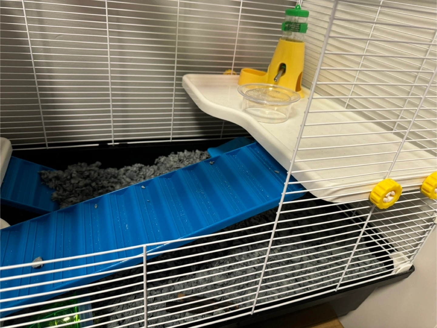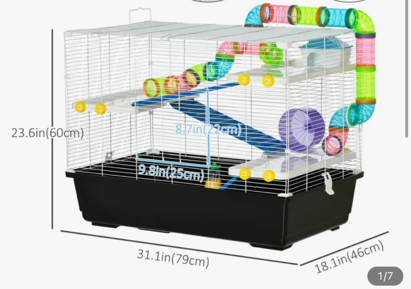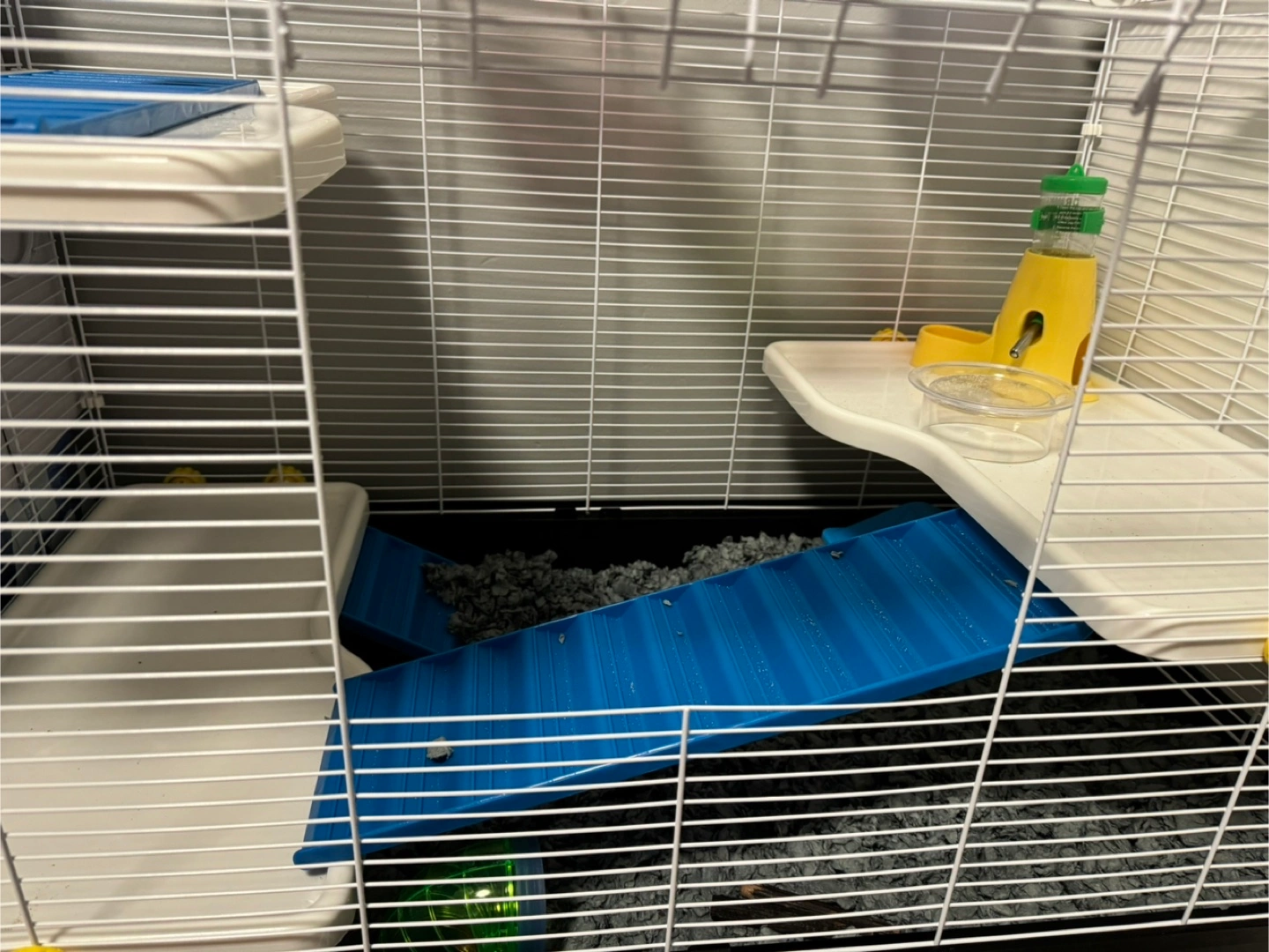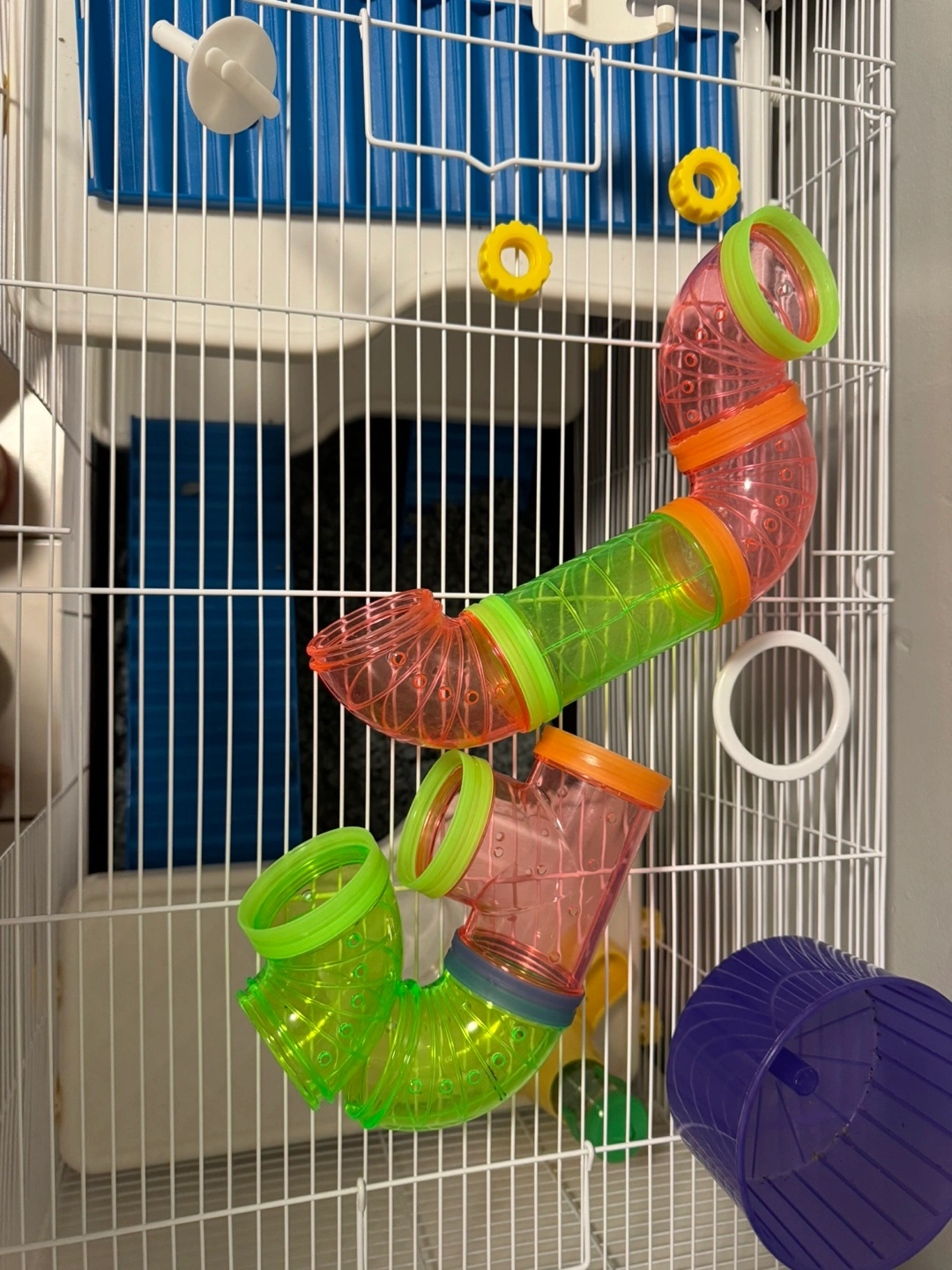 Large multi-level cage. Includes ramps, platforms, water bottle, food bowl, and tubes. Great for small animals. Some minor wear.