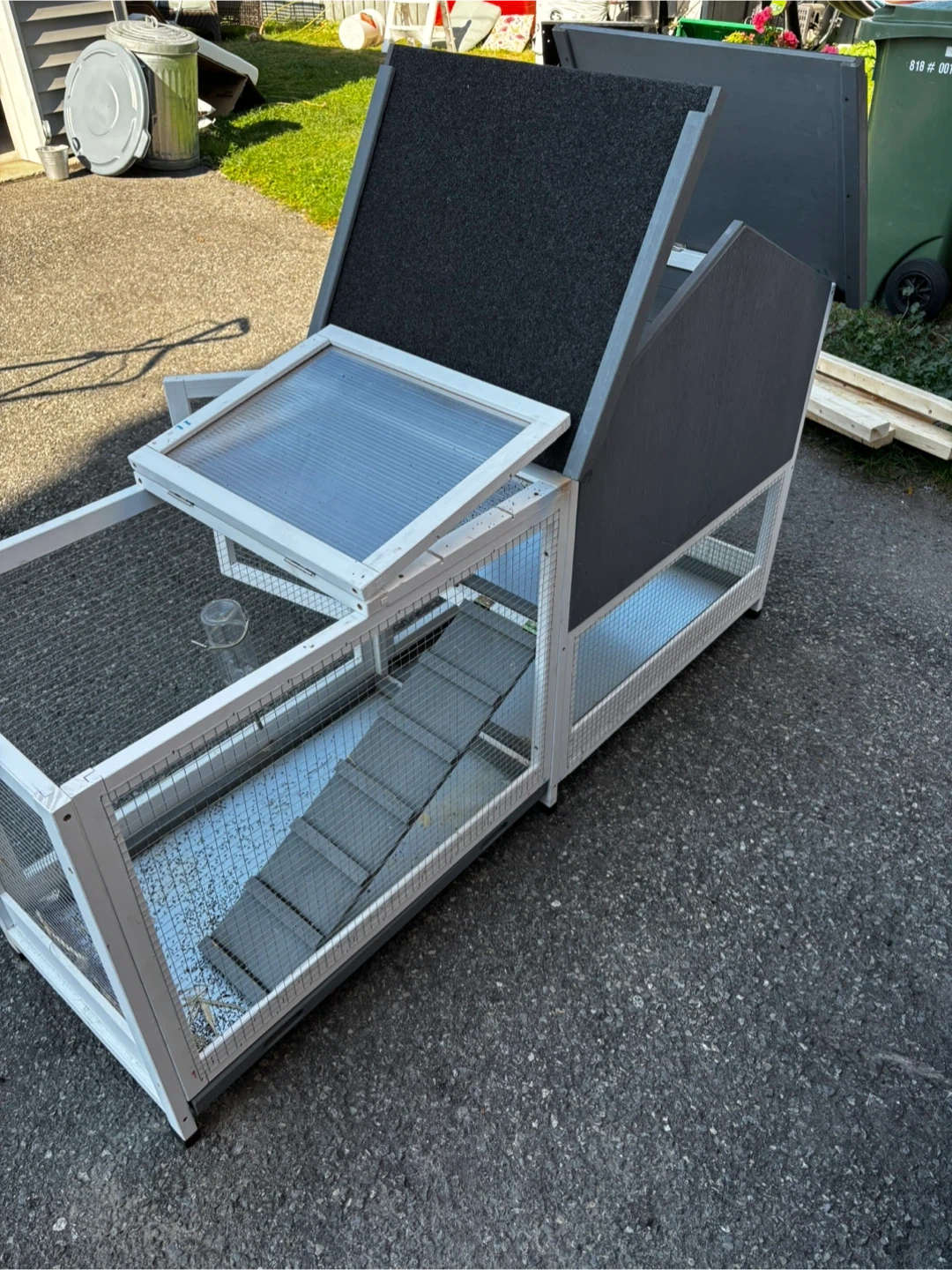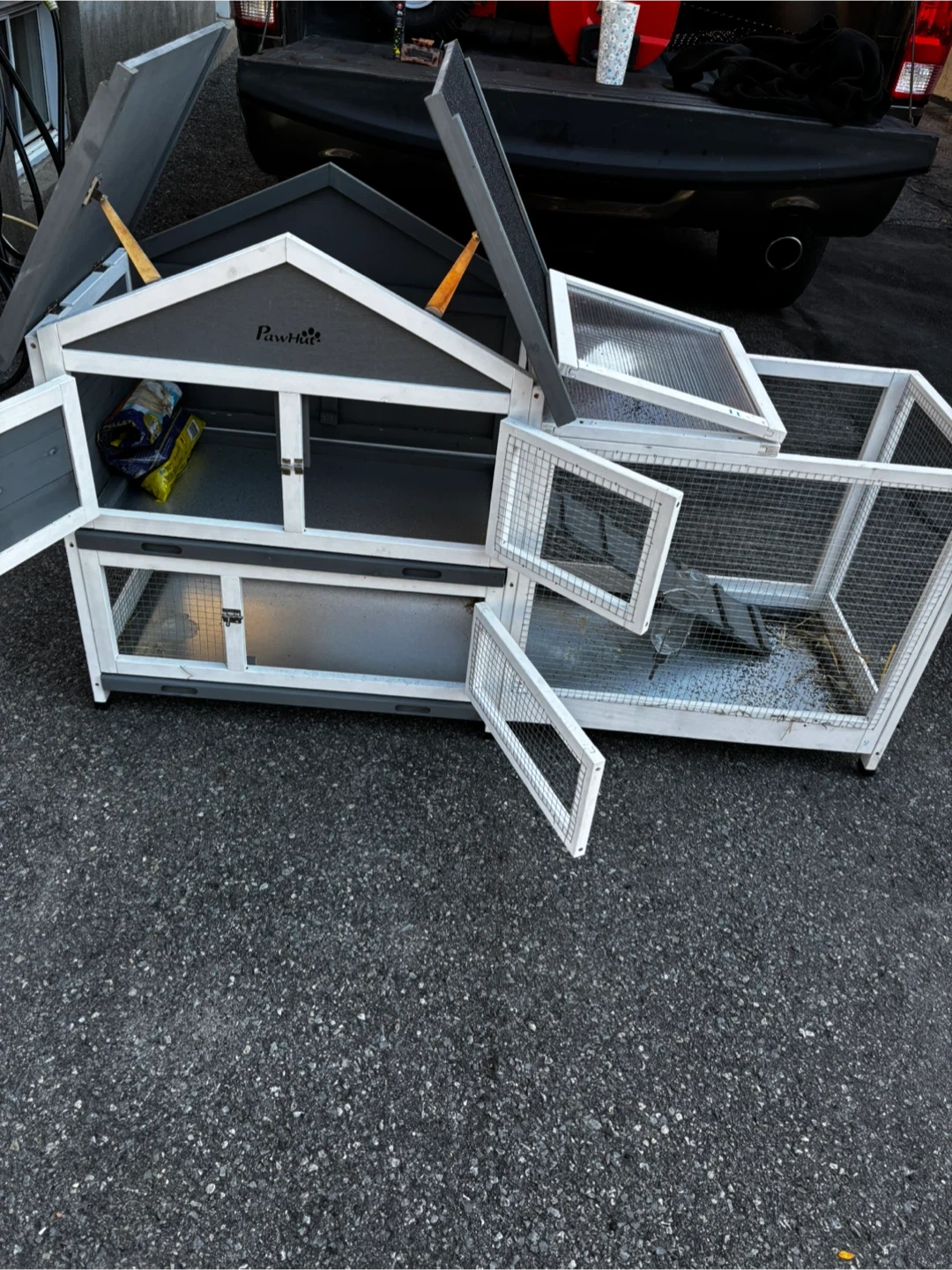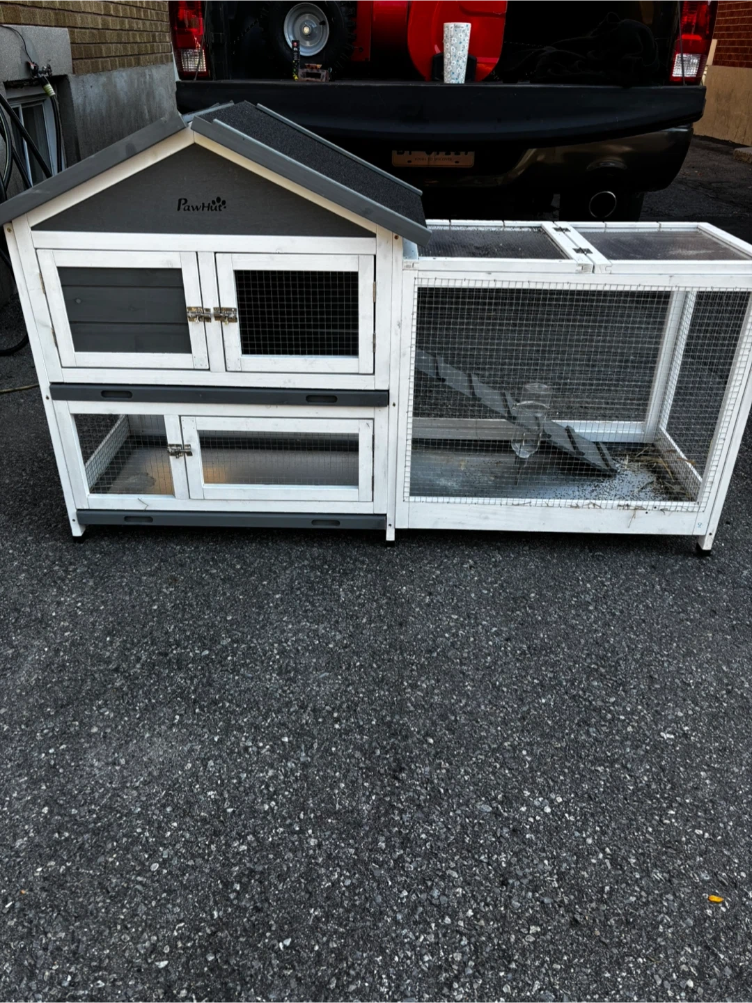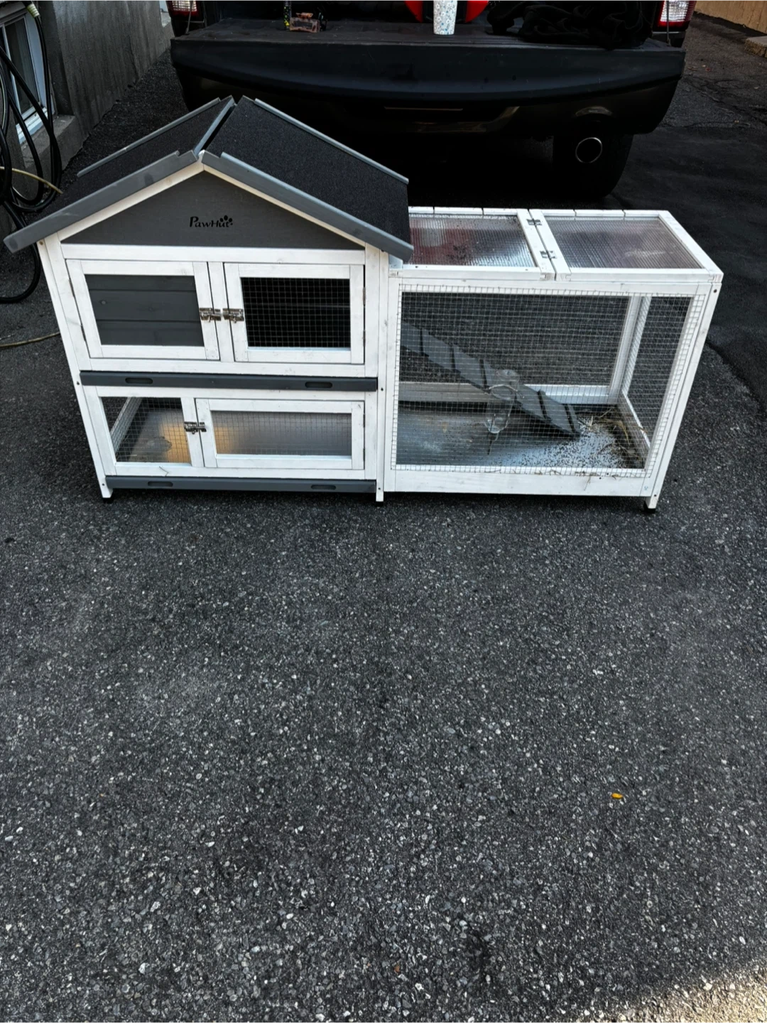 Selling a PawHut rabbit hutch or chicken coop. It's in good condition and ready for a new home for your furry or feathered friends! It features a two-story design with a ramp for easy access. The hutch has both enclosed and open areas, providing a comfortable and secure space for your pets.