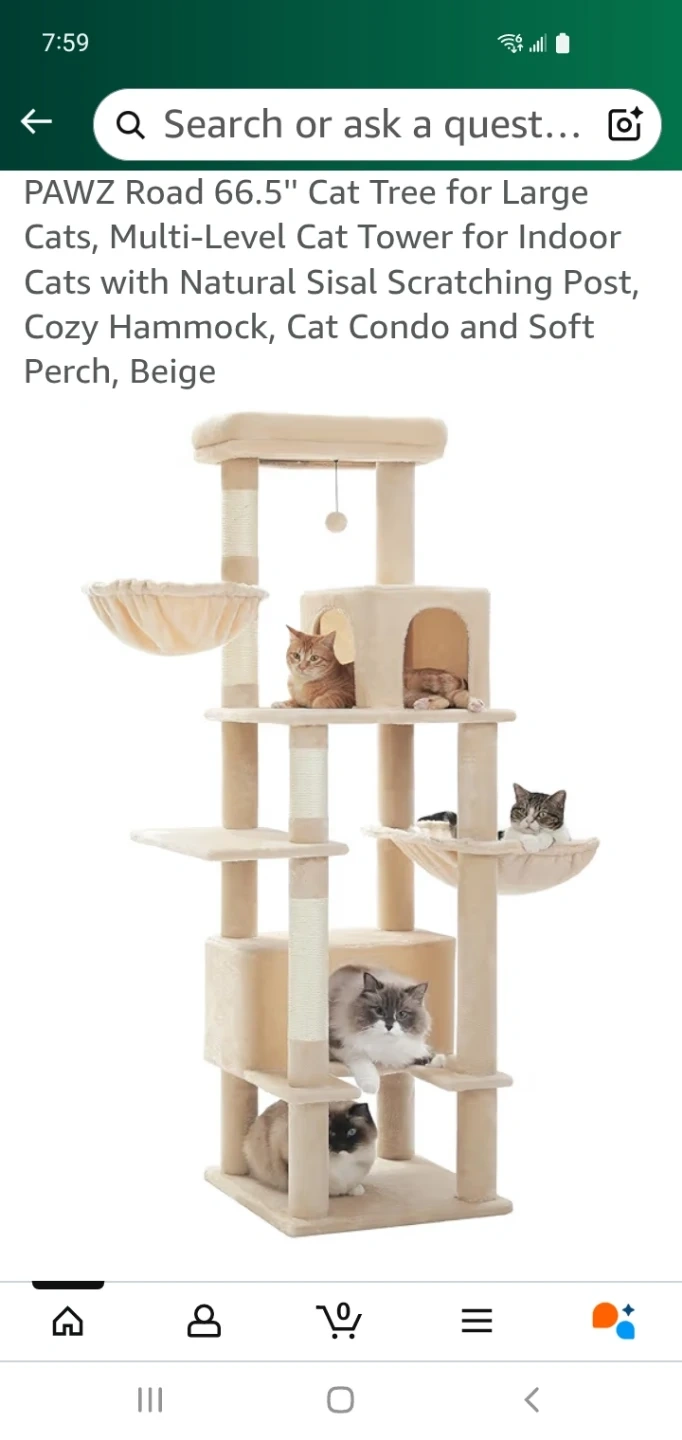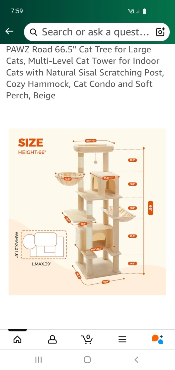 41Purchased on Amazon for 145.00 but no longer needed. Still in box. This PAWZ Road cat tree is perfect for your feline friends! It's a multi-level cat tower designed for indoor cats. Features include a natural sisal scratching post, cozy hammock, cat condo, and soft perch. The colour is beige. Key Specifications: - Height: 66.5 inches - Width: Max 21.16 inches - Length: Max 39 inches
