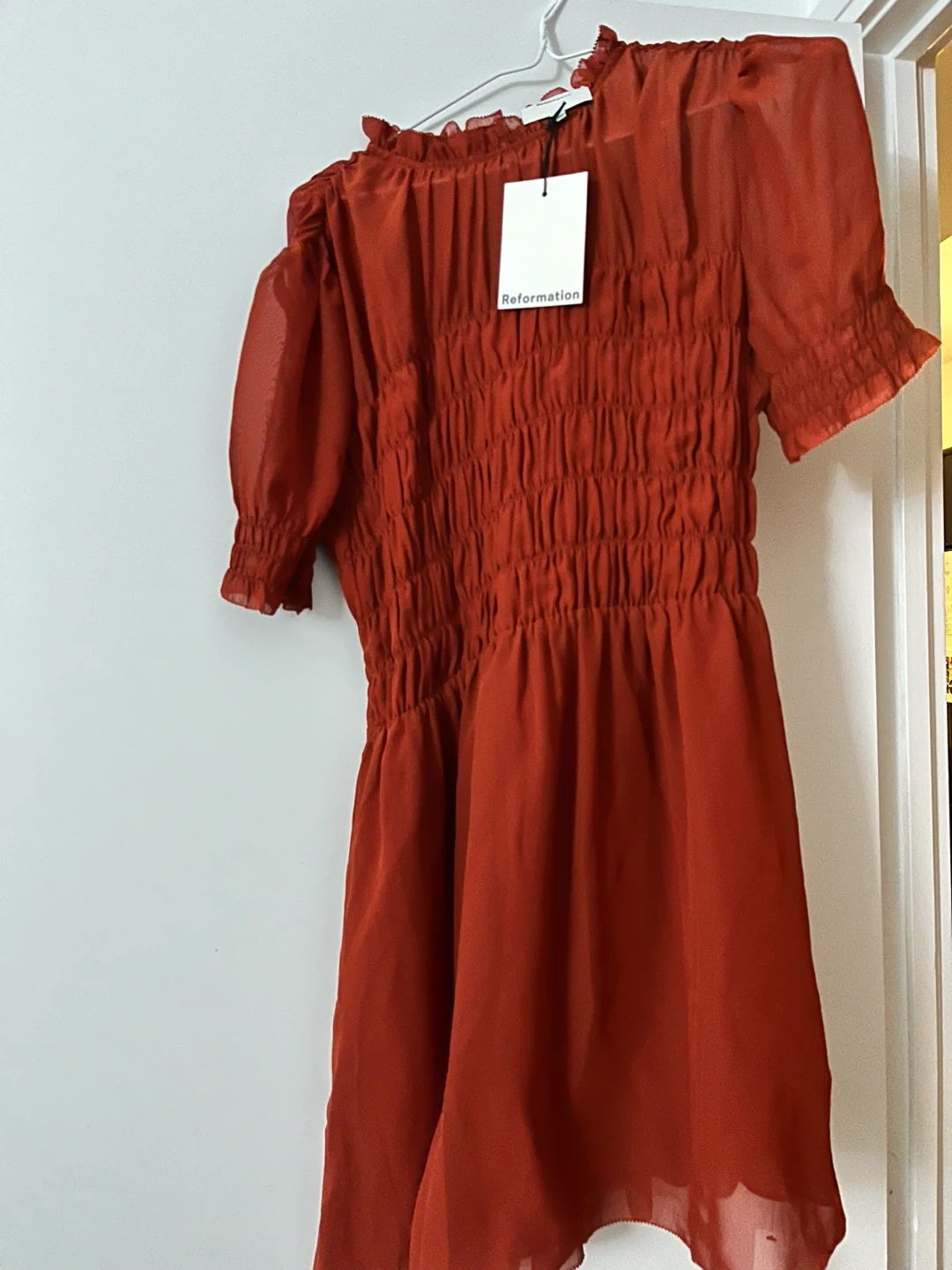 Here's a lovely red dress from Reformation! It's in brand new condition, never worn and ready for a new owner. The dress features a smocked bodice and short sleeves, perfect for a stylish and comfortable look