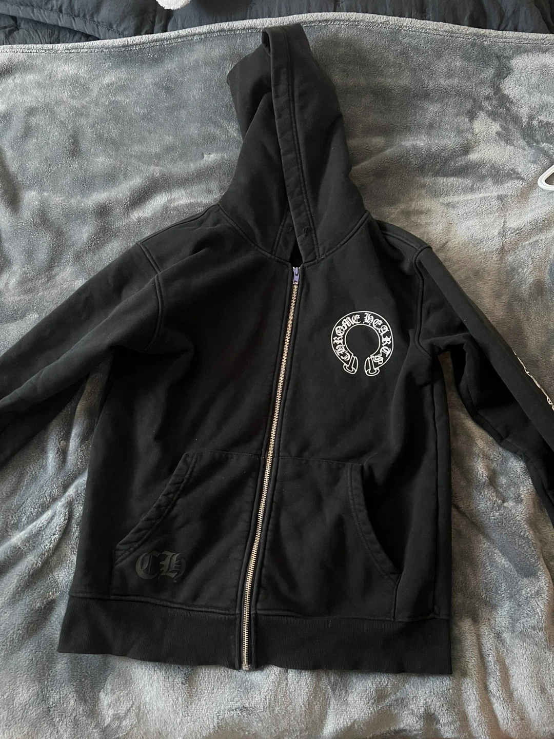 Classic black Chrome Hearts zip-up hoodie. Features the iconic circular logo on the back and decorative scrollwork on the sleeves. It's made from a comfortable cotton blend.
