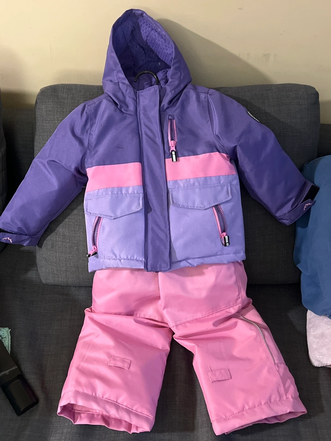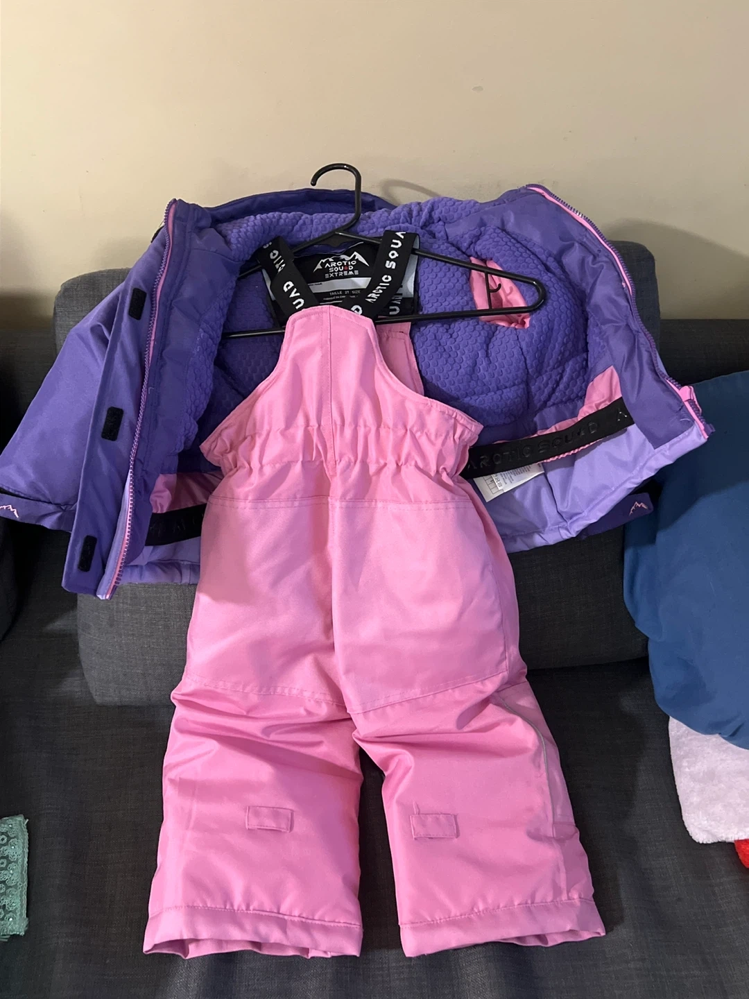 This Arctic squid snowsuit set includes a purple hooded jacket with pink accents and matching pink snow pants. It's designed for kids' winter adventures. Great for staying warm and dry on the slopes or in the snow!