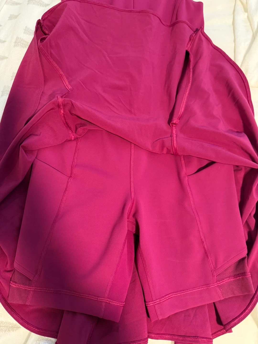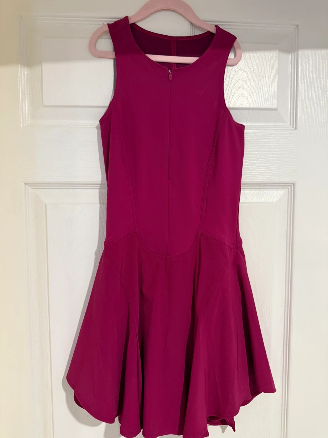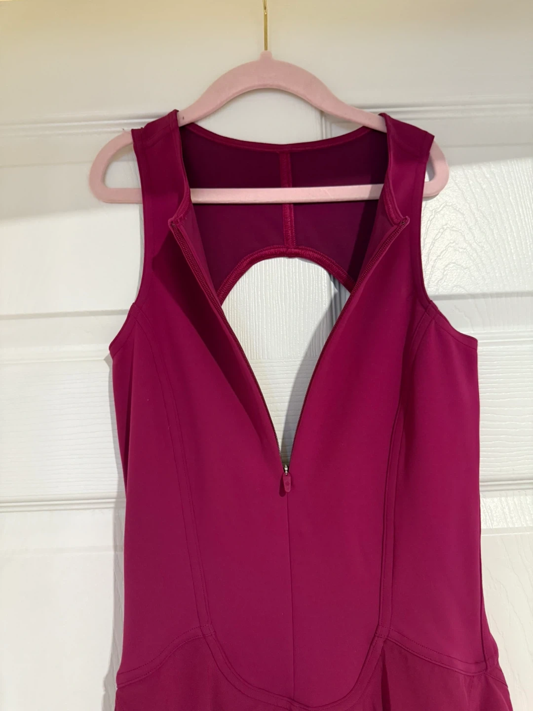 This Lululemon tennis dress is a vibrant magenta colour and features built-in shorts. It has a full zipper down the front and a cut-out detail at the back. Perfect for hitting the courts!