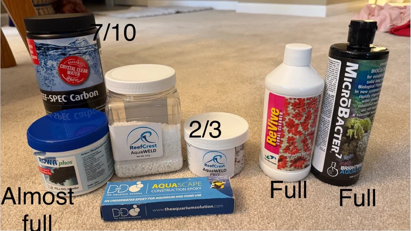 Collection of aquarium water treatments including Red Sea Reef-Spec Carbon (7/10 full), ROWA phos (almost full), ReefCrest AquaWELD (2/3 full) and ReefCrest AquaWELD PRO, plus The Aquarium Solution AquaScape epoxy. Also includes Brightwell Aquatics MicroBacter7 and ReVive Coral Cleaner, both full. These are useful for maintaining healthy marine and freshwater aquariums.