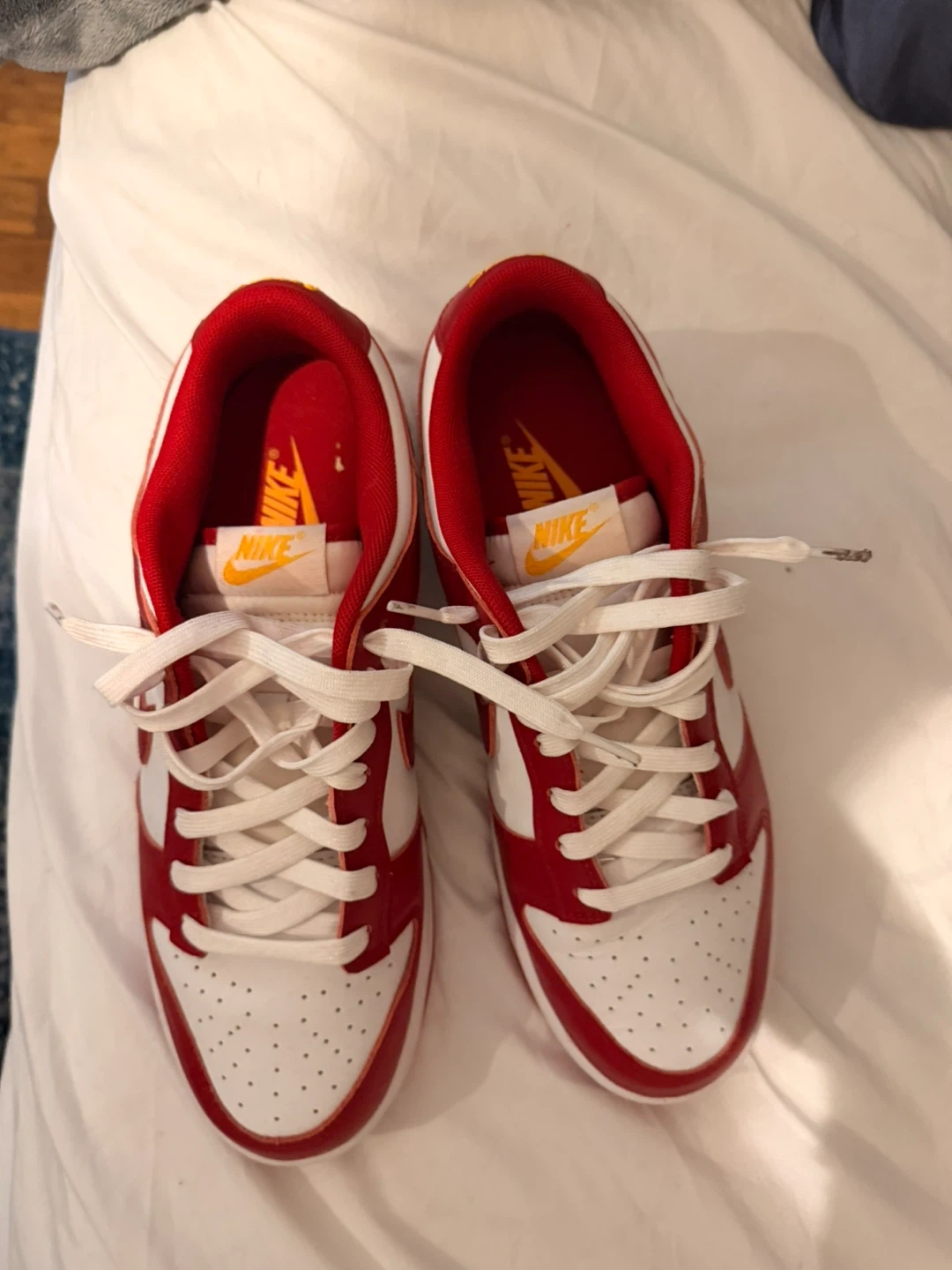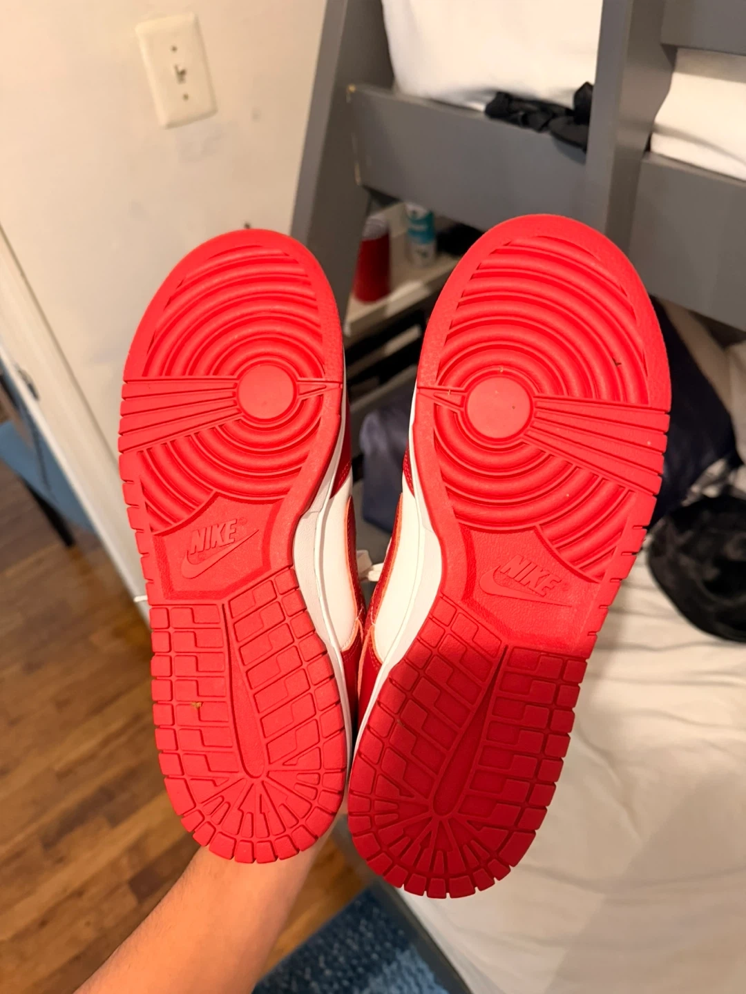 These are Nike Dunk Low sneakers in a red and white colorway. They feature a leather and synthetic material construction. The rubber outsole provides traction.