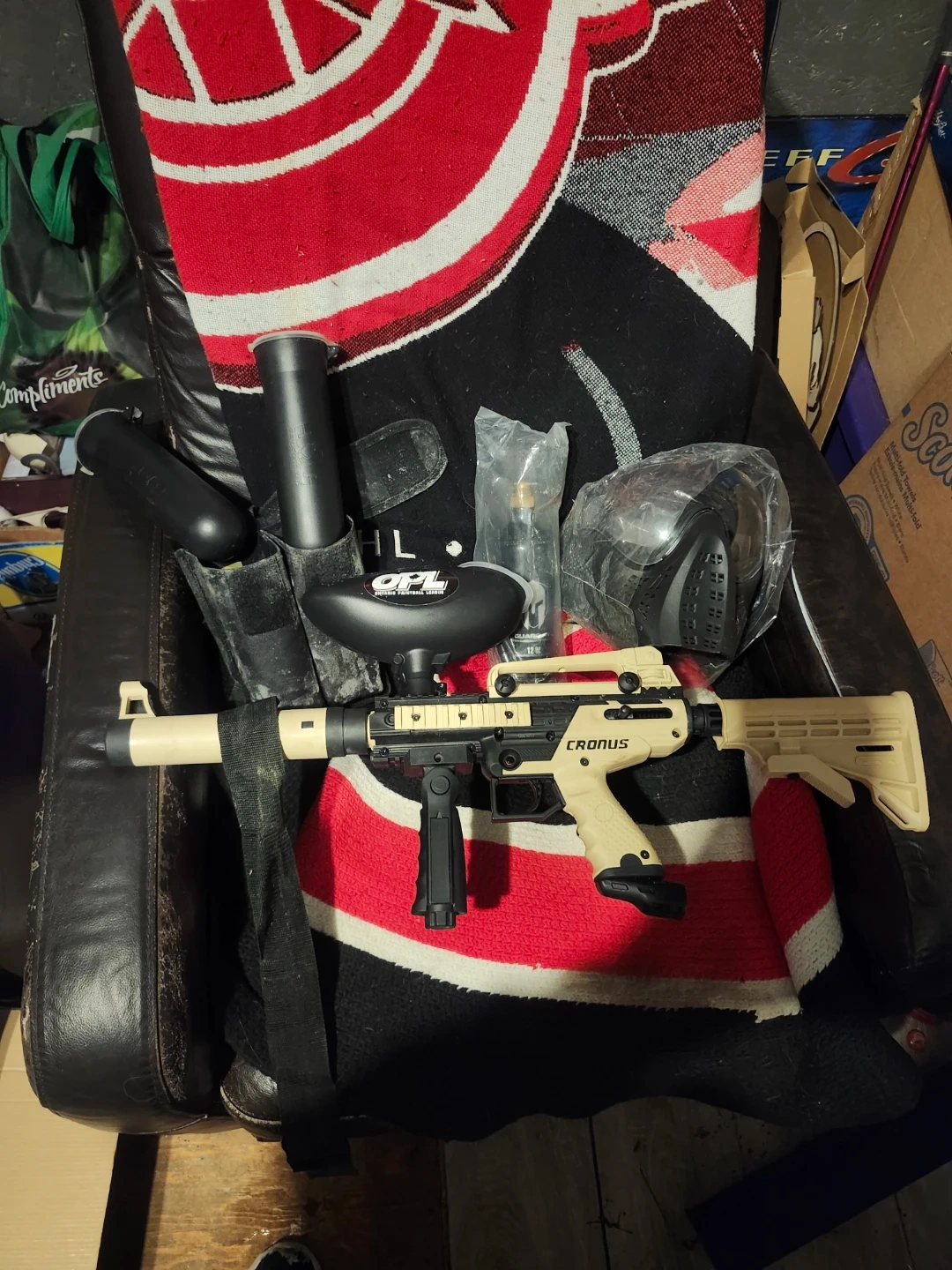 This is a Cronus paintball marker. It comes with a mask, hopper, and other accessories. It's a great starter kit for the sport!