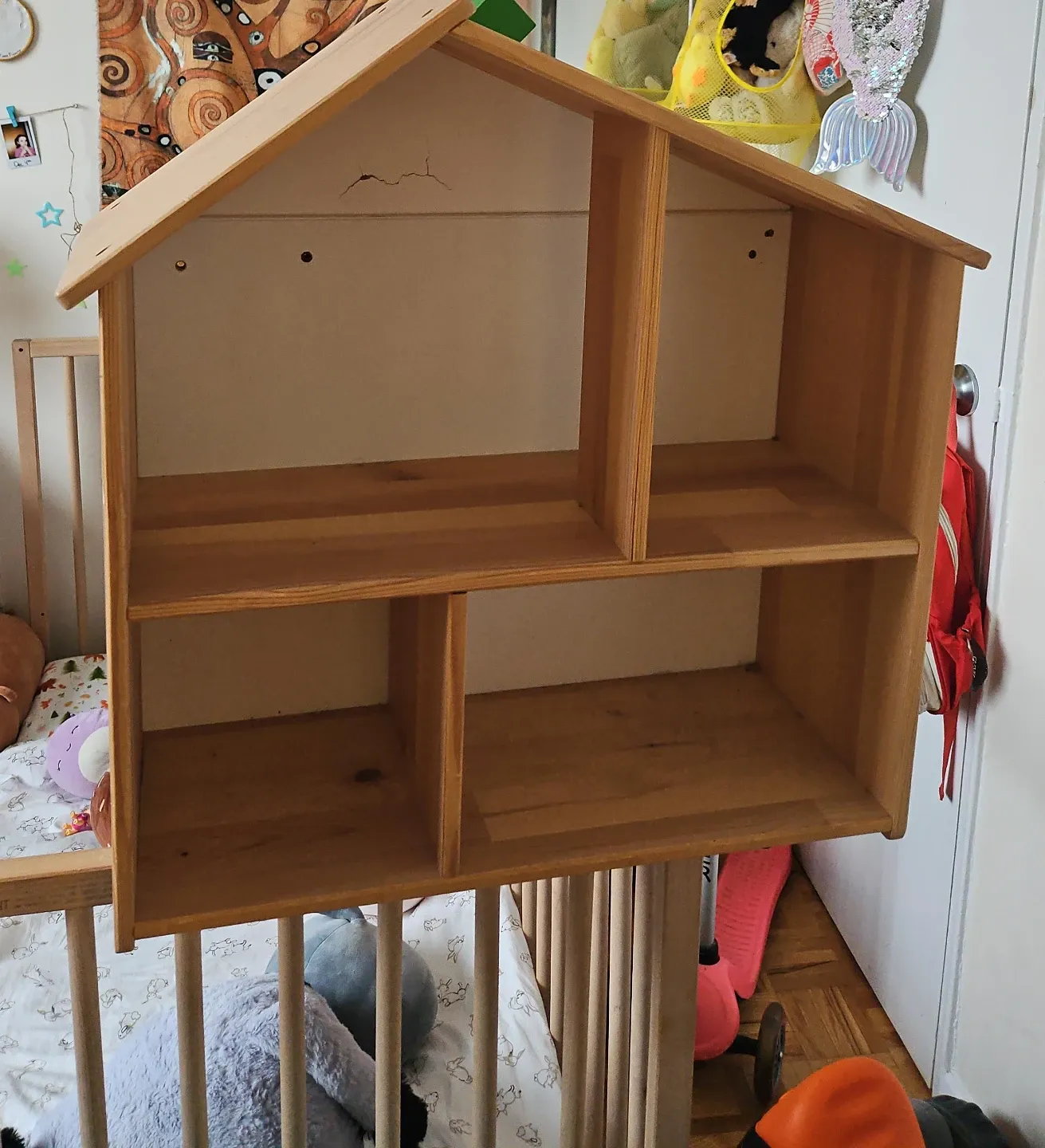 This is a wooden dollhouse shelf, perfect for displaying small toys or dolls. It has multiple compartments for storage and organization. It's made of natural wood and has a simple, classic design.