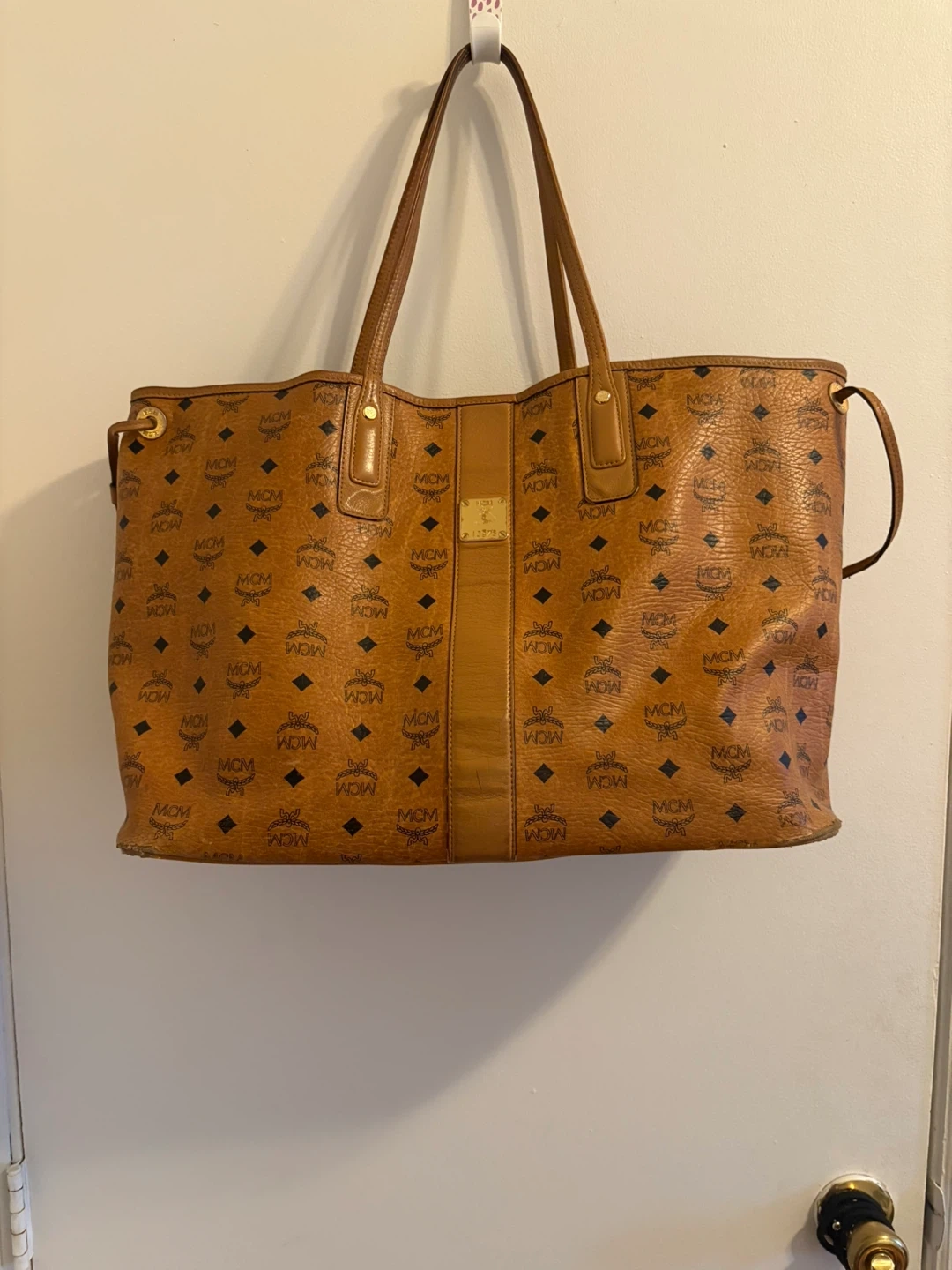 This is a stylish MCM tote bag with a unique vintage design. It features the classic MCM logo pattern. The bag shows some signs of wear, adding to its vintage charm. It's a great everyday bag!