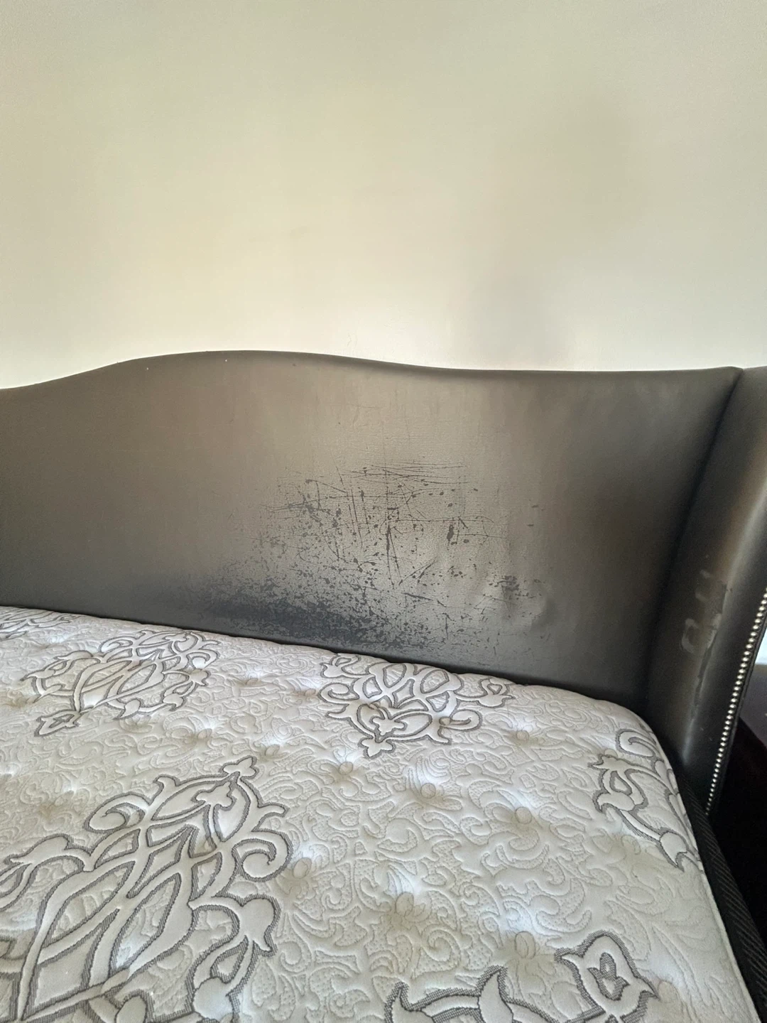 This is a king-sized wingback bed frame upholstered in dark grey faux leather. The headboard has some scuffing and marks. Includes a matching mattress with a grey and white patterned top. Must to go immediately. Pick up in Whitby.