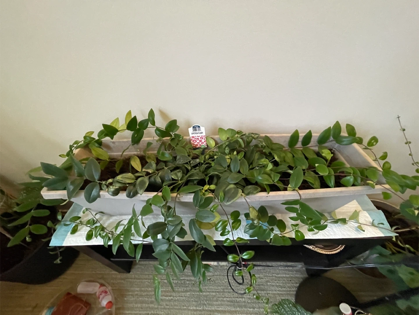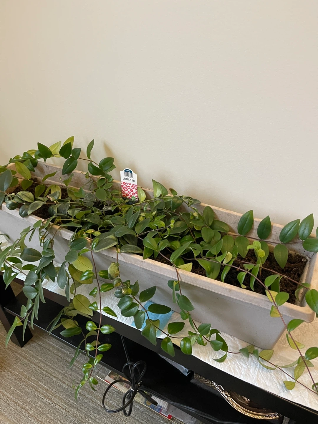 Healthy lipstick plant in a light beige planter with drainage holes. It's a trailing plant with lush green leaves. Lots of new growth is visible, and it's growing fast. Ready for a new home!