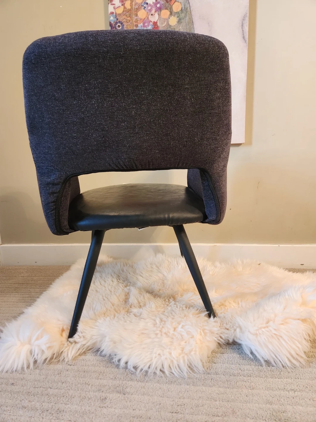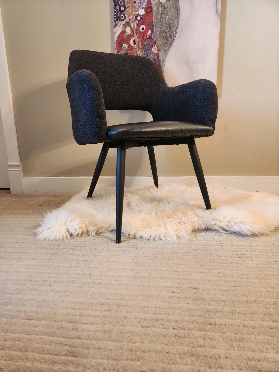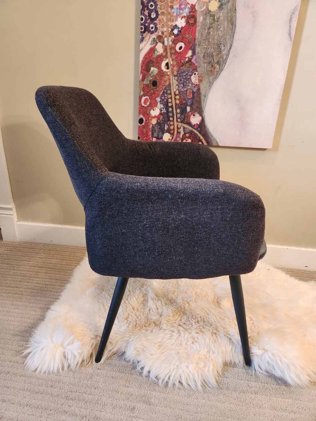 This like new Accent chair featuring dark grey textured upholstery and a black seat has a mid century modern style. Comfortable design with black metal tapered legs makes this chair sturdy and stylish. Makes a fantastic desk or vanity chair. This chair adds sleek sophistication to any living space. Seat surface is 18x20 and 17 inches high, arms are 22 inches apart, top of chair back is 30 inches high.