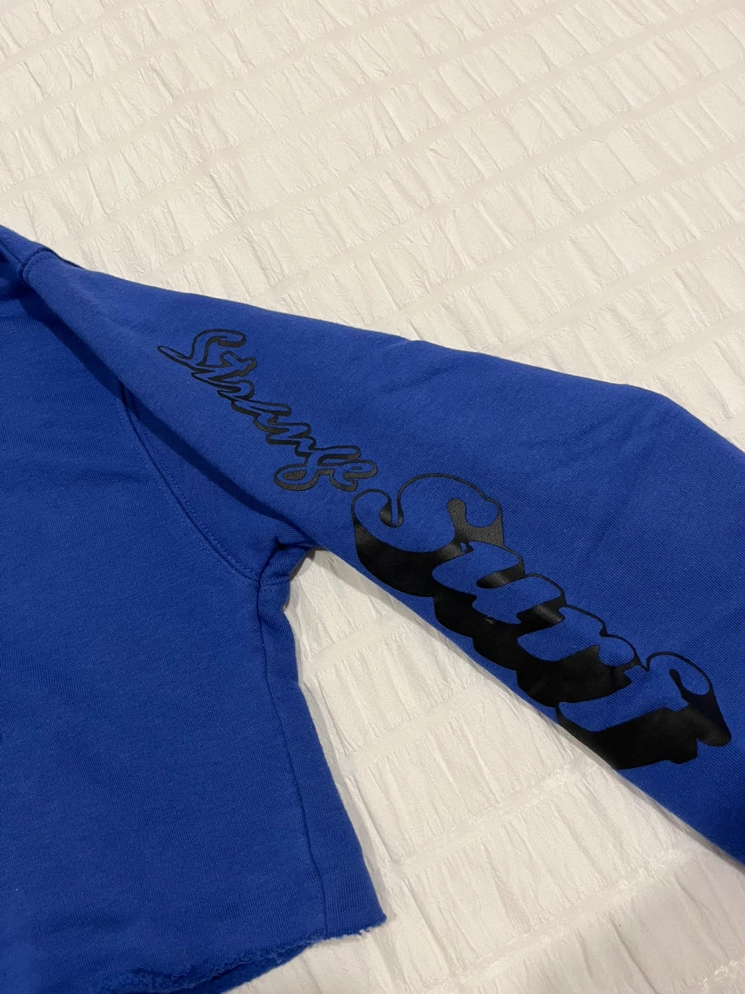 This is a brand new cropped hoodie from Tna with a "Strange Surf" graphic. It's bright blue and features a sunset graphic with palm trees on the front and text graphics down the sleeves. The material is a soft cotton blend. Perfect for casual wear!
