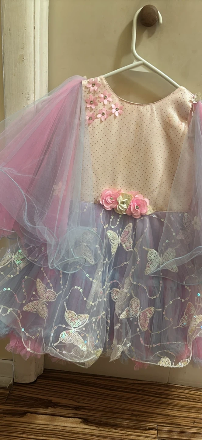 This enchanting dress features a delicate polka dot bodice adorned with floral appliques and sparkling sequins. The skirt is crafted from layers of pink and purple tulle, embellished with butterfly appliques and more sequins. It's perfect for special occasions!