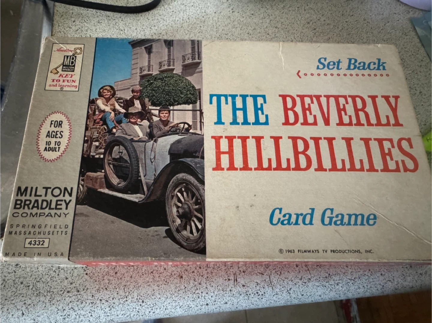 This is The Beverly Hillbillies card game by Milton Bradley. It's suitable for ages 10 to adult. The copyright is from 1963.