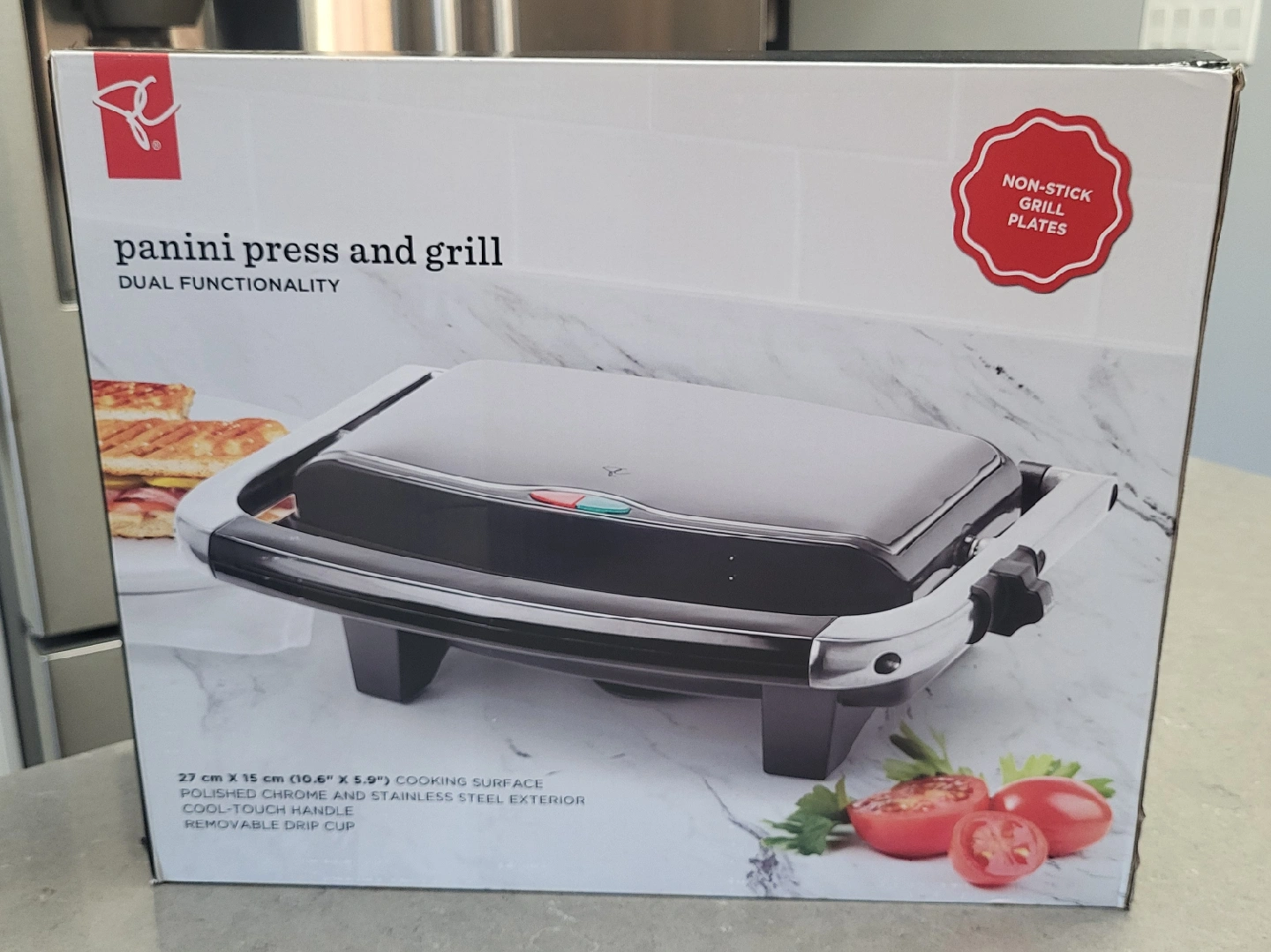 Selling a PC panini press and grill with dual functionality. It features a 27 cm x 15 cm (10.6" x 5.9") cooking surface, polished chrome and stainless steel exterior, a cool-touch handle, and a removable drip cup. The grill plates are non-stick for easy cleaning. Brand new. Smoke and pet free home.