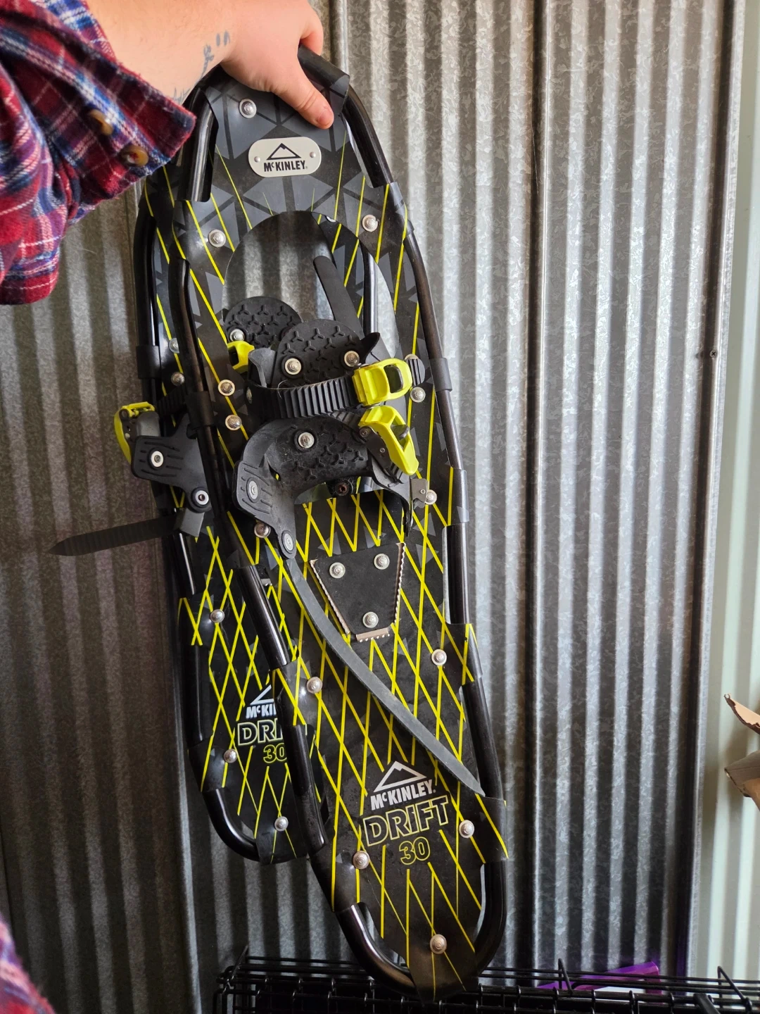 McKinley Drift 30 snowshoes in black and yellow. They're designed for walking on snow. Includes adjustable bindings for a secure fit. Never used.