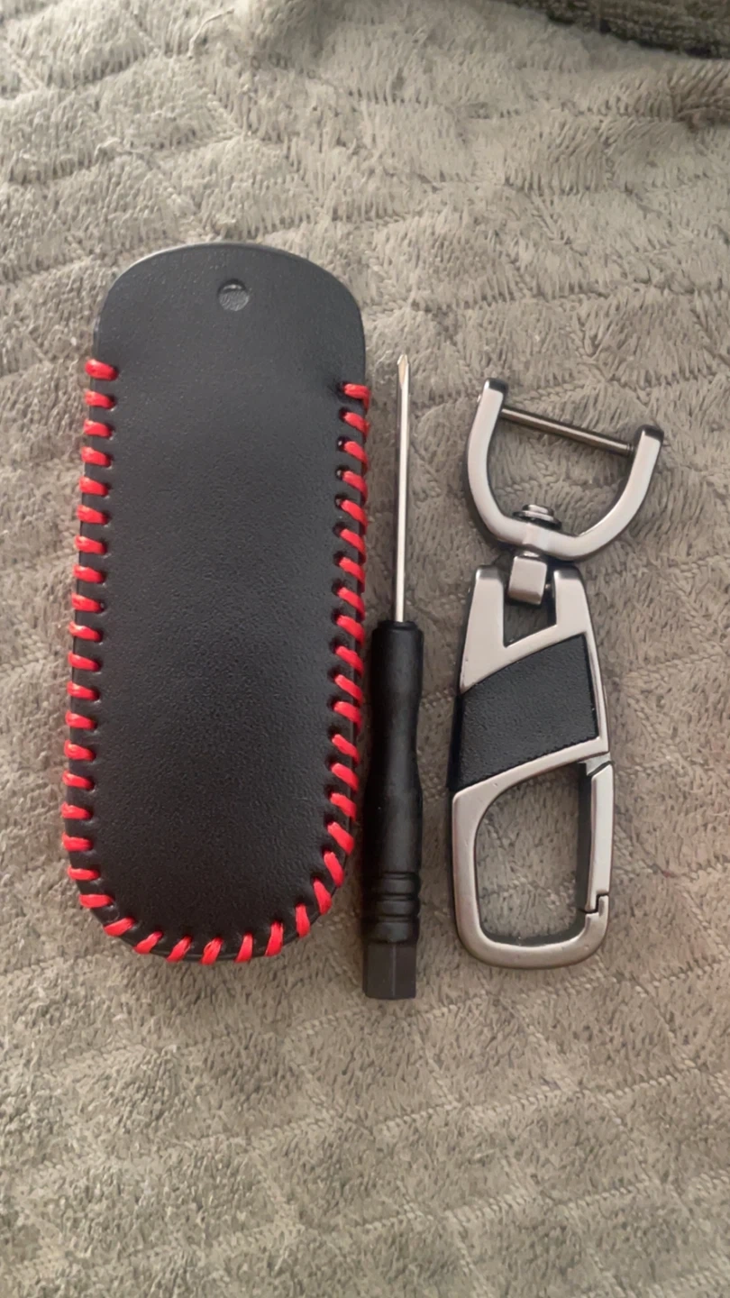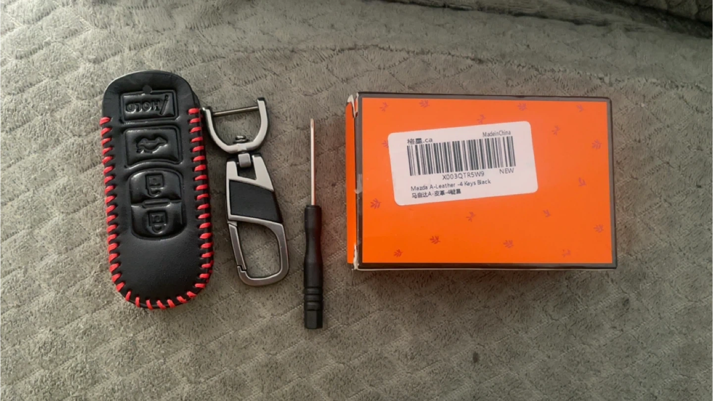 Mazda key fob cover and keychain set for 4-button keys. Made of black leather with red stitching. Includes a small screwdriver for installation. Comes in original packaging.