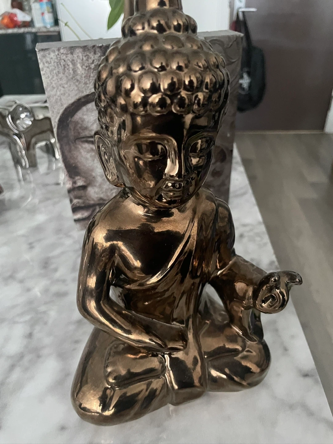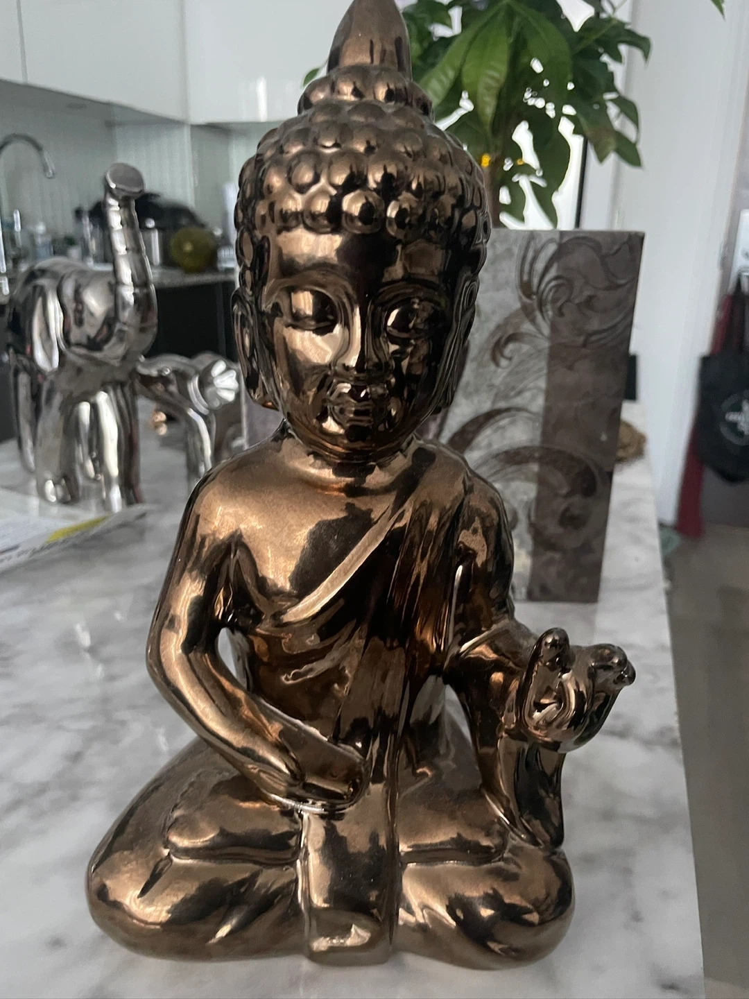 This shiny bronze-coloured Buddha figurine is a nice decorative piece. It's made of ceramic and has a glossy finish. It's perfect for adding a touch of serenity to your home decor.