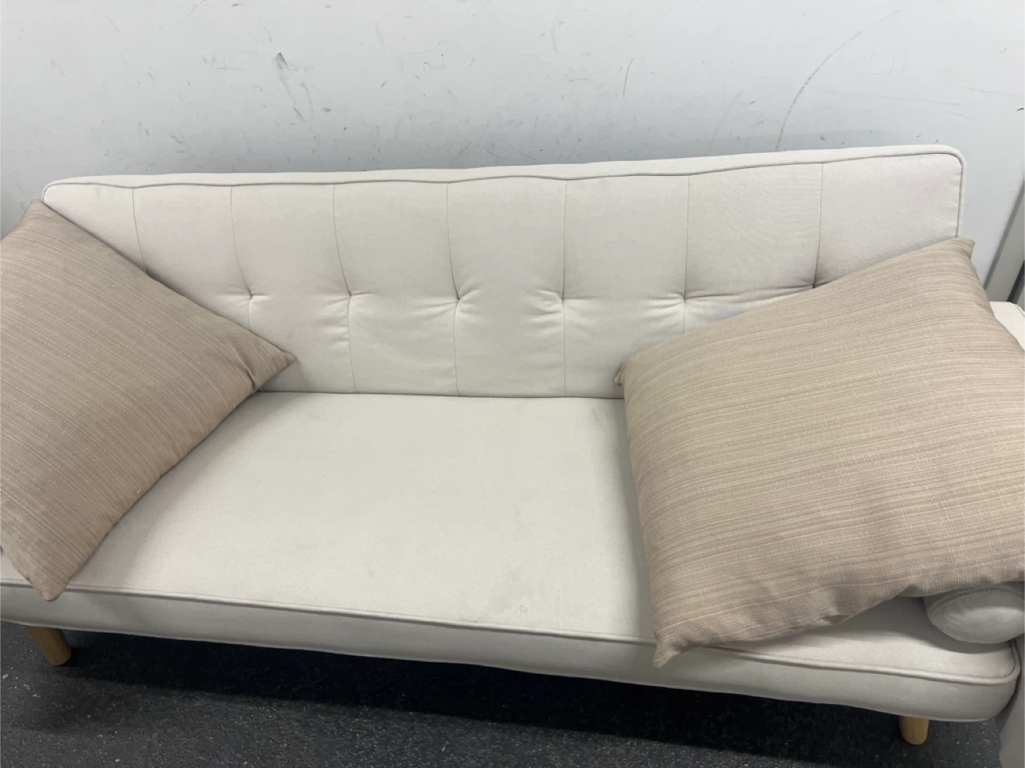 This futon sofa is a light cream or off-white colour. It includes two matching throw pillows with a subtle striped pattern. The sofa has tufted detailing on the backrest and arms. Its legs are made of wood. This piece is suitable for a living room or guest room.