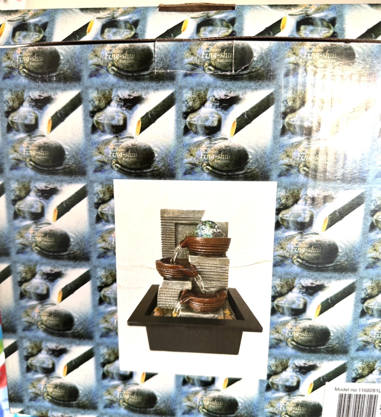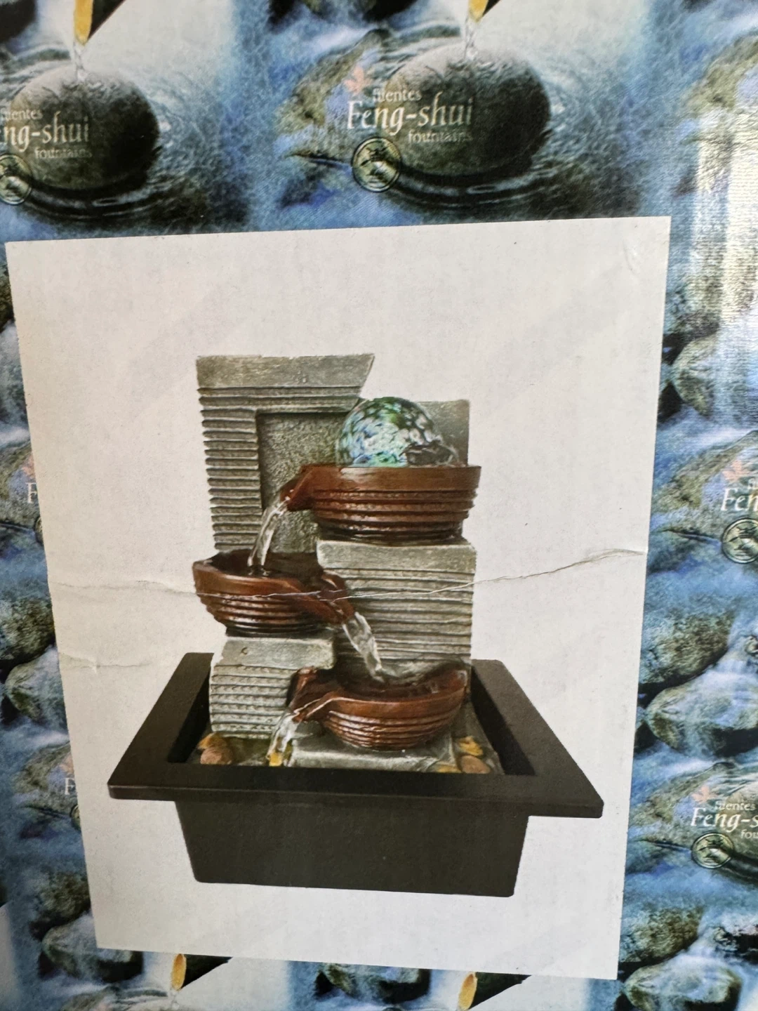 A tabletop Feng Shui fountain with multiple tiers. It's designed to create a calming atmosphere. Includes a small white box inside, likely for a pump or adapter.