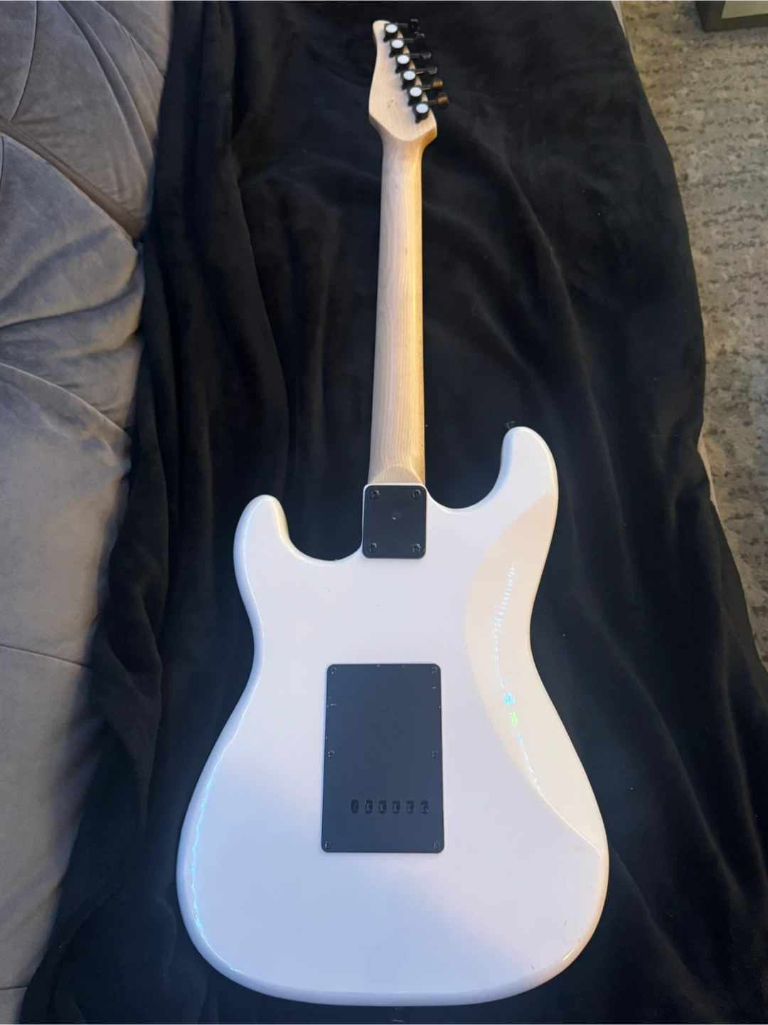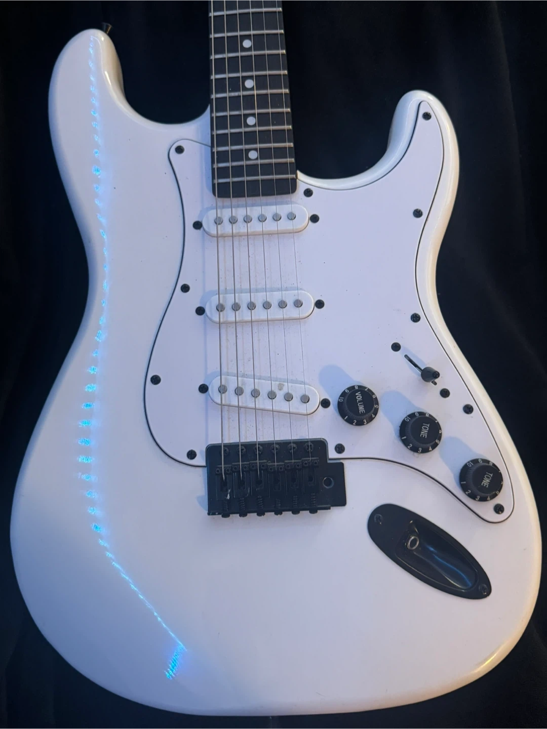 This is a white LyxPro electric guitar. It has a maple neck and a rosewood fretboard. The guitar features three single-coil pickups and a tremolo bridge. It's ready for practice or performance!