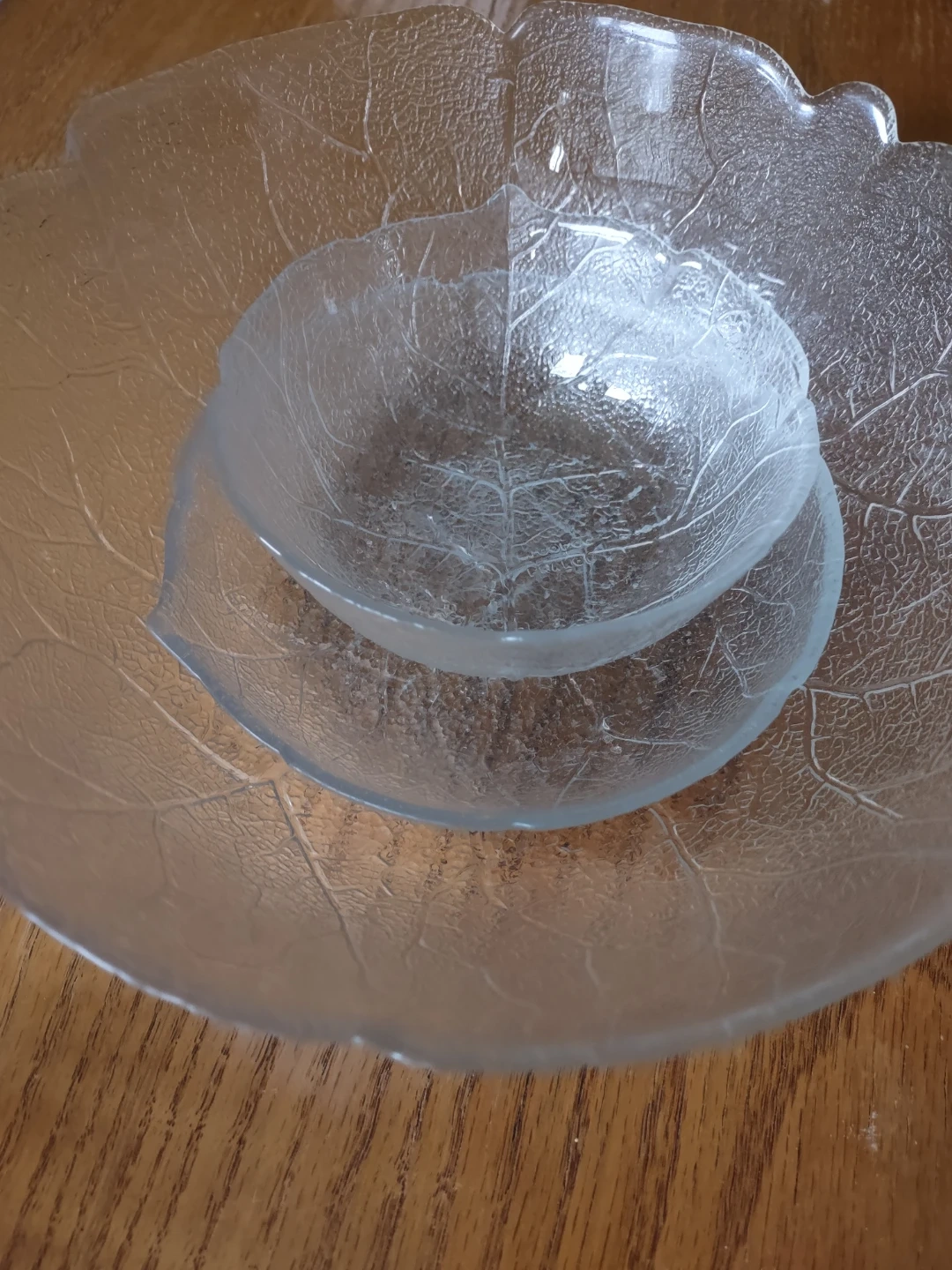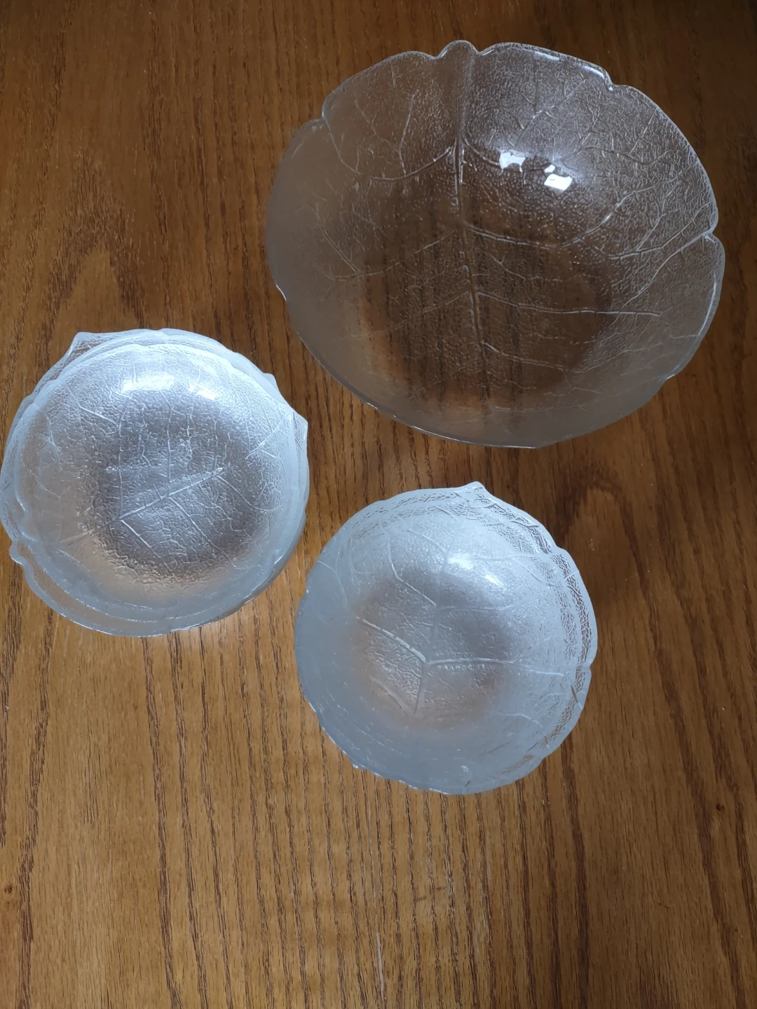 This is a set of 11 clear glass bowls. They feature a delicate embossed leaf vein design. The set includes one large serving bowl and 10 smaller individual bowls.