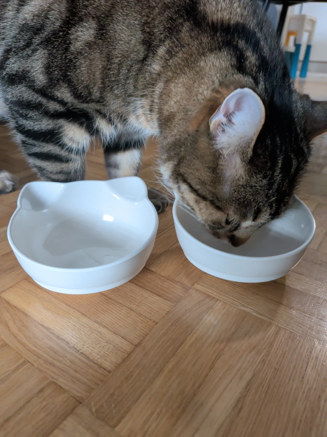 Two white plastic pet bowls shaped like cat faces. They come with a black metal stand to elevate them. Perfect for feeding your cat or small dog.