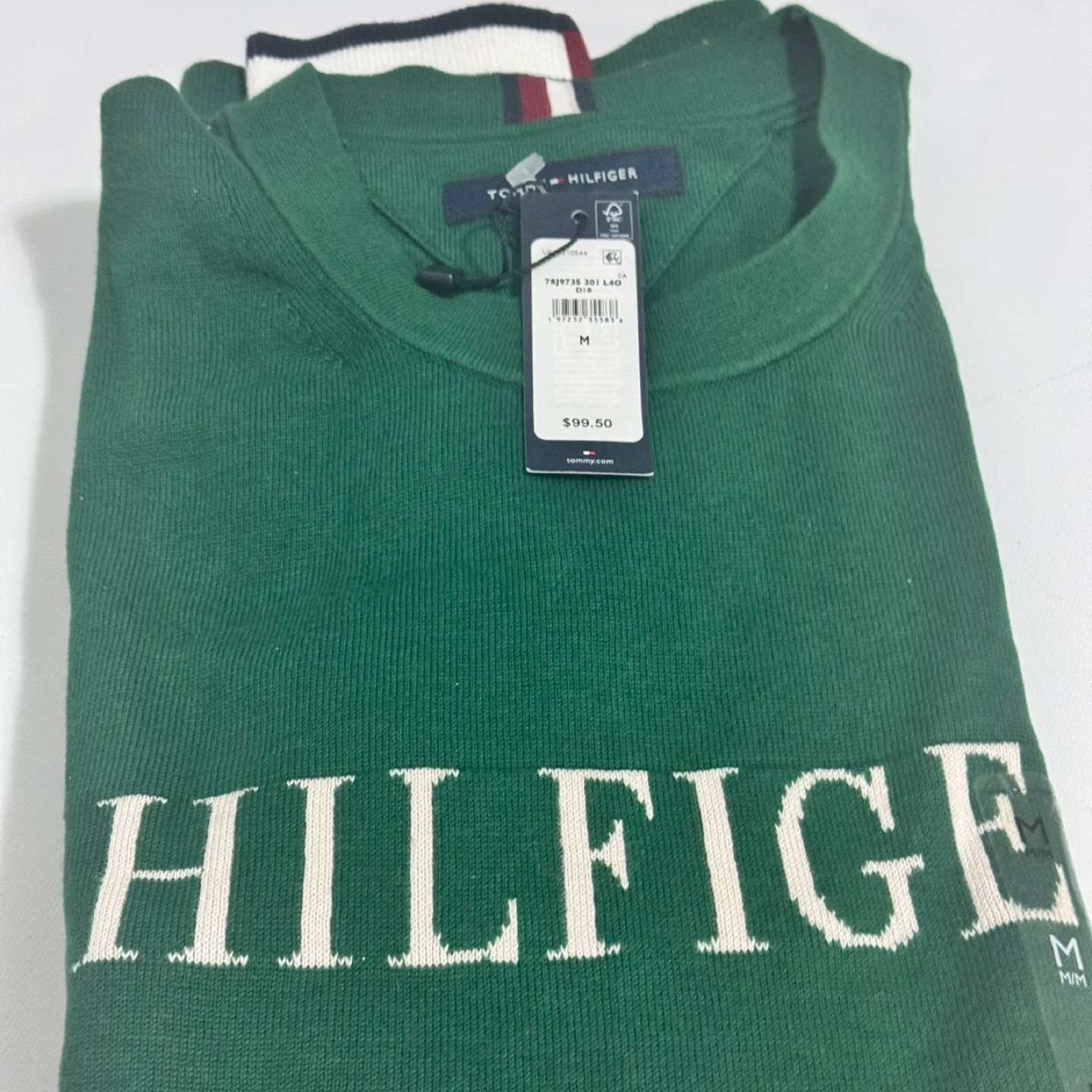 Tommy Hilfiger crew neck sweater in green with large "HILFIGER" graphic across the chest. It features ribbed cuffs with red, white, and blue stripes. Size medium.
