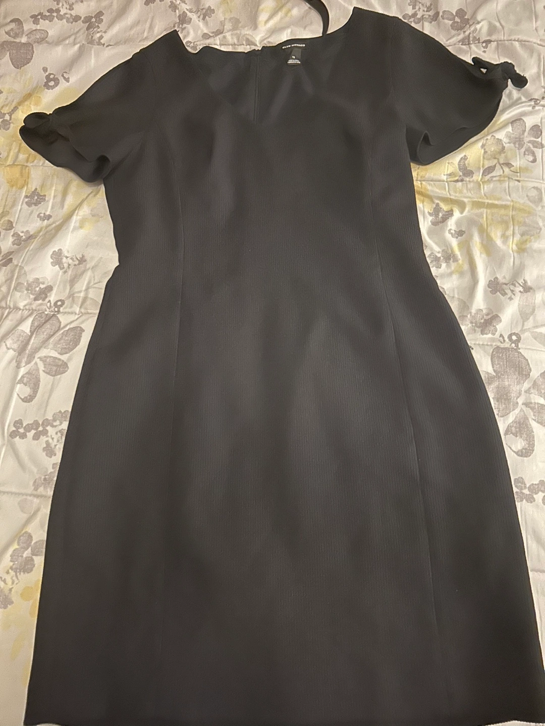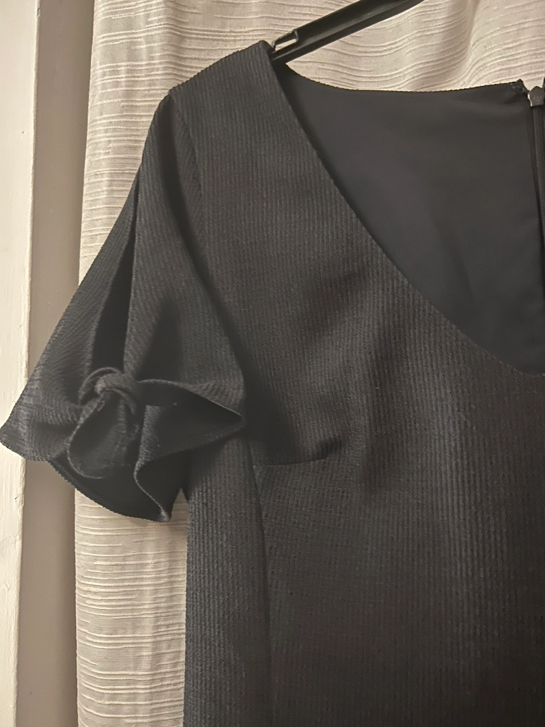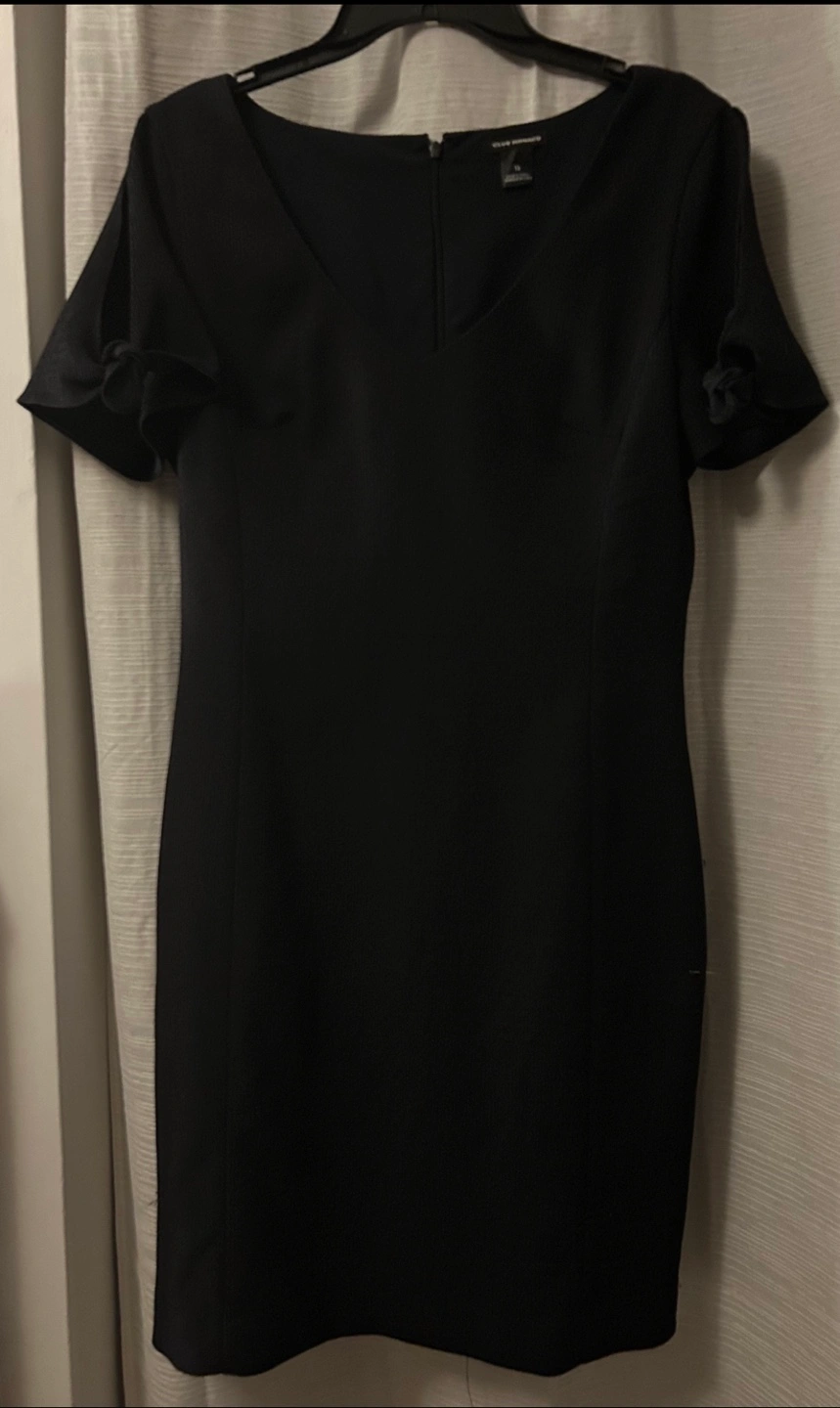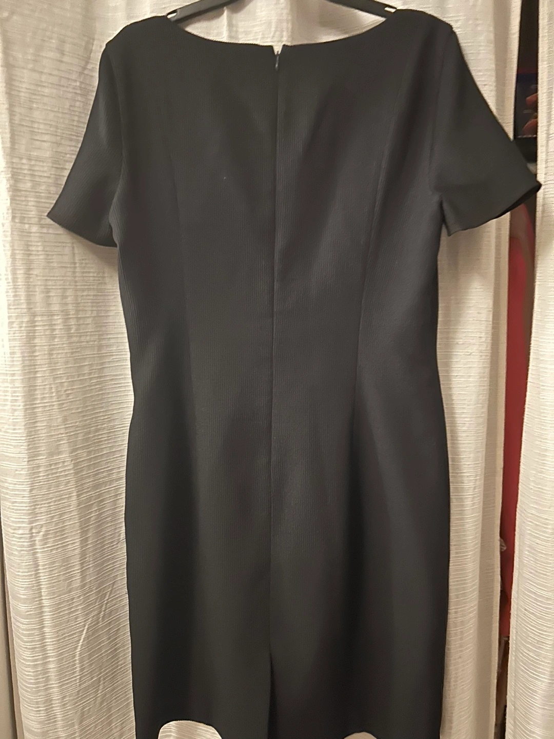 Elegant black sheath dress. Short sleeves with unique detailing. V-neckline. Size 12.