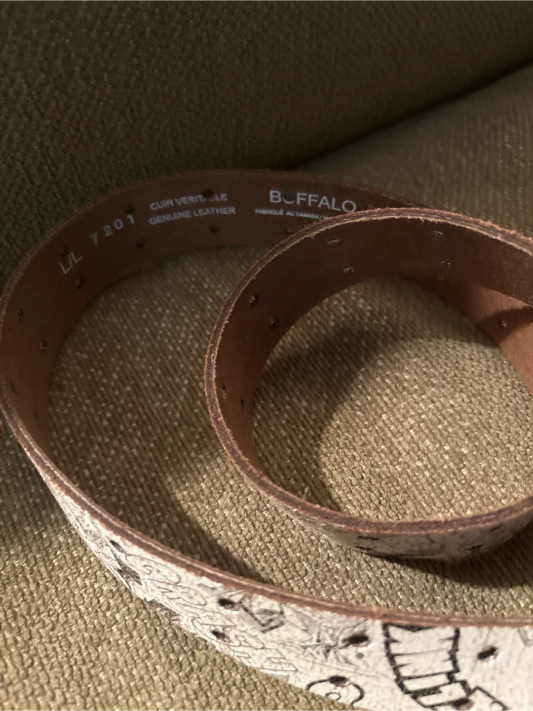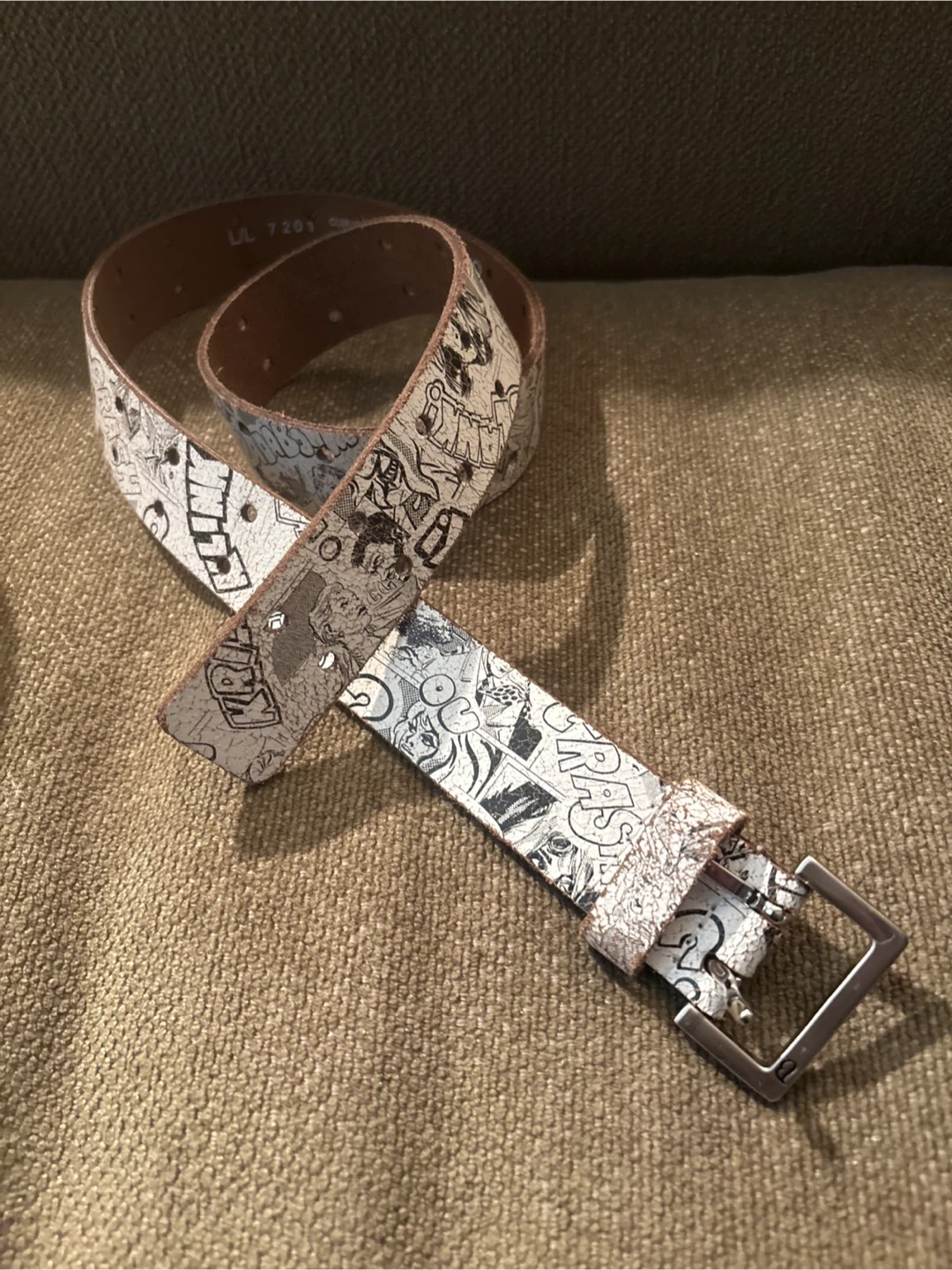 Selling a Buffalo brand belt made of genuine leather. It's a size L/L and features a unique comic book style design. The belt shows some signs of wear, but is still in good condition and ready to be worn!