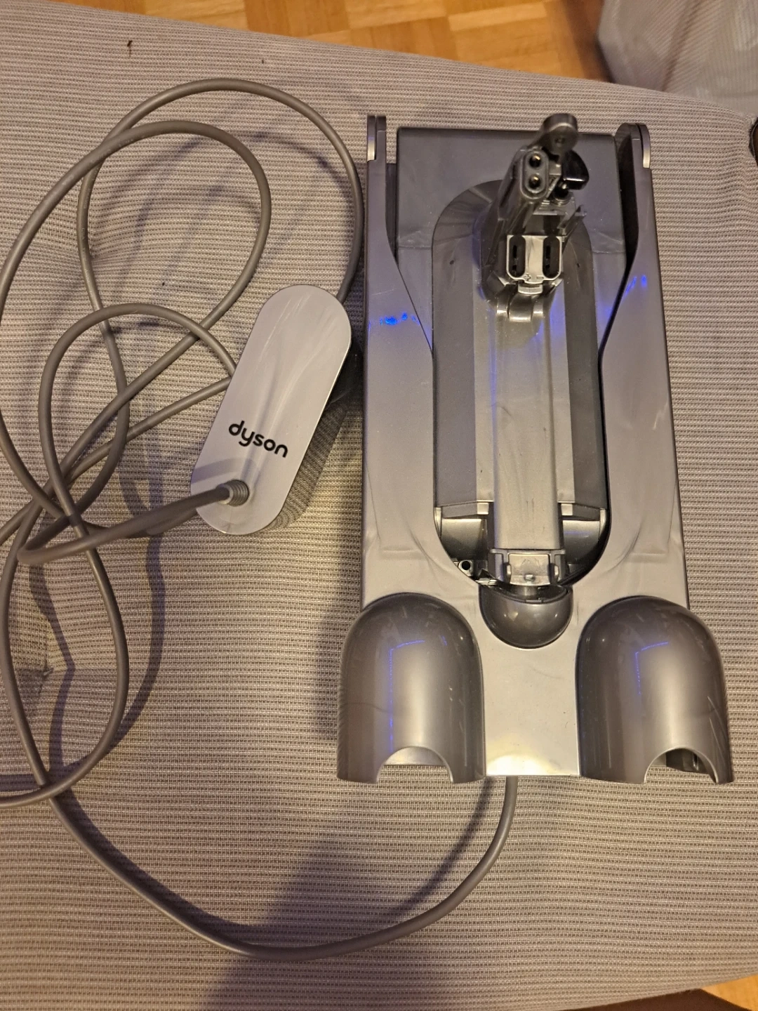 This is a charging dock and battery pack for a Dyson vacuum cleaner. It includes the charging base and a removable battery. The dock has indicator lights when plugged in. It's a useful replacement part or spare.