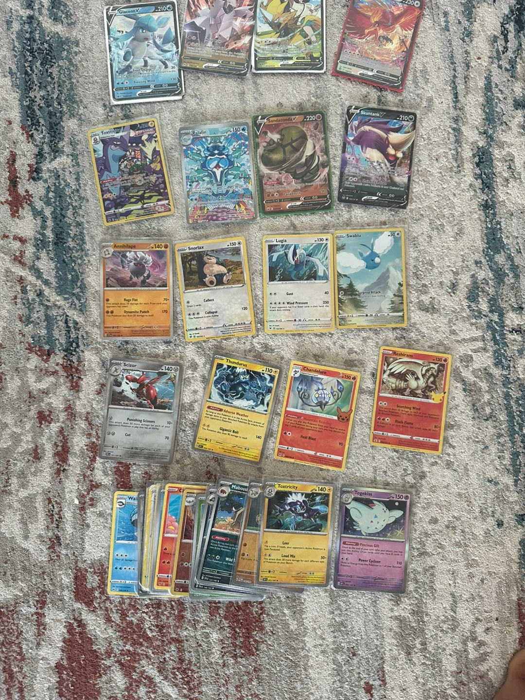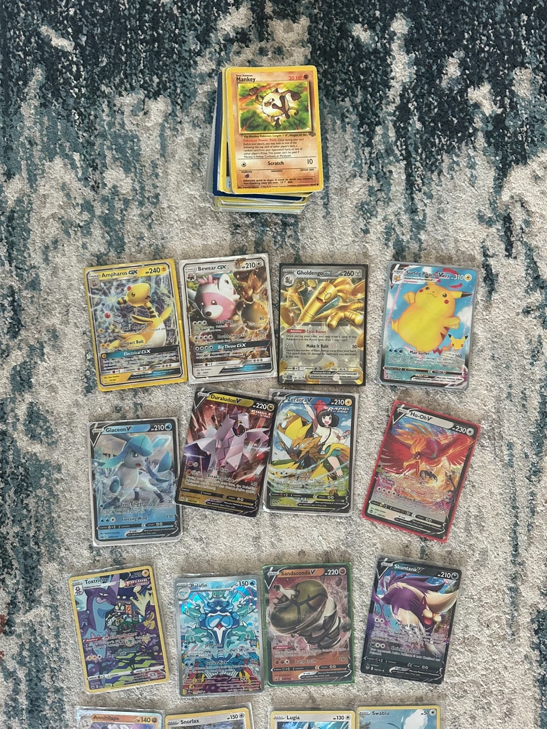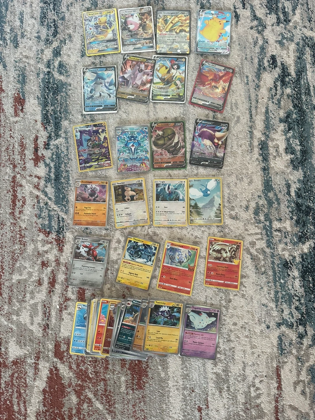 Collection of assorted Pokémon trading cards featuring various characters and rarities. Cards include holographic and V/VMAX variants. Great for collectors and players alike!