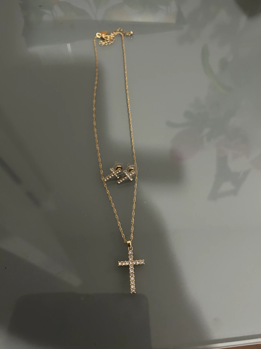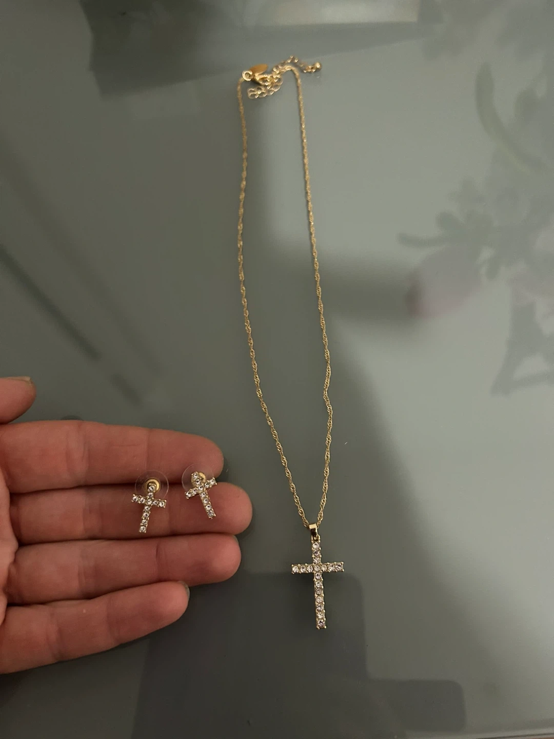This set includes a gold-tone necklace with a cross pendant and a matching pair of cross stud earrings. Both pieces are embellished with clear stones. It's a lovely accessory for everyday wear or special occasions.