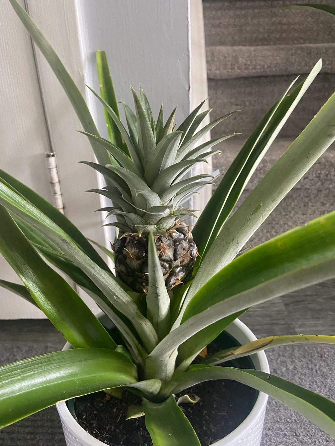 A vibrant potted pineapple plant, complete with a developing fruit! It's planted in a stylish white textured pot. These make a unique addition to any home or garden space.