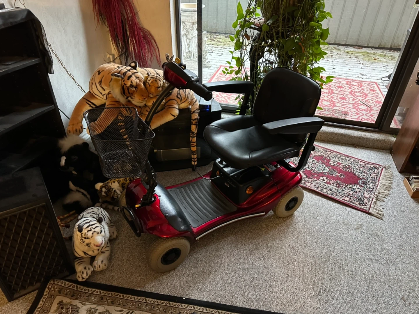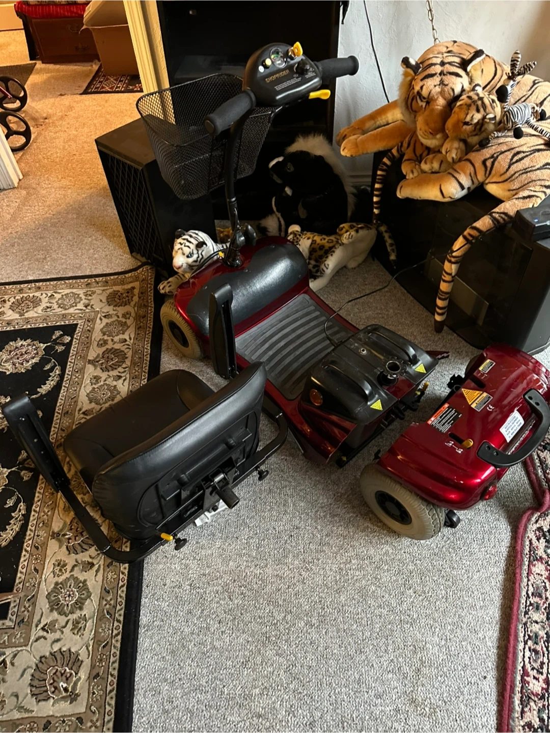 Shoprider portable scooter in good condition. It has a battery charge indicator and a front basket for storage. Its seat is adjustable for comfort.
