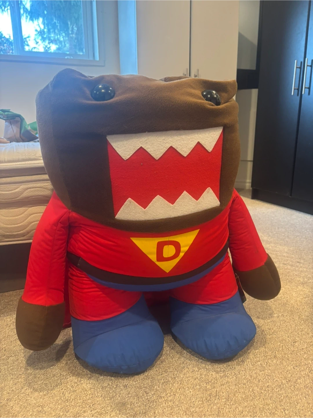 This is a large plush toy of Domokun, dressed as a superhero. It's soft and huggable, perfect for fans of the character! It's a fun decorative item for a room.