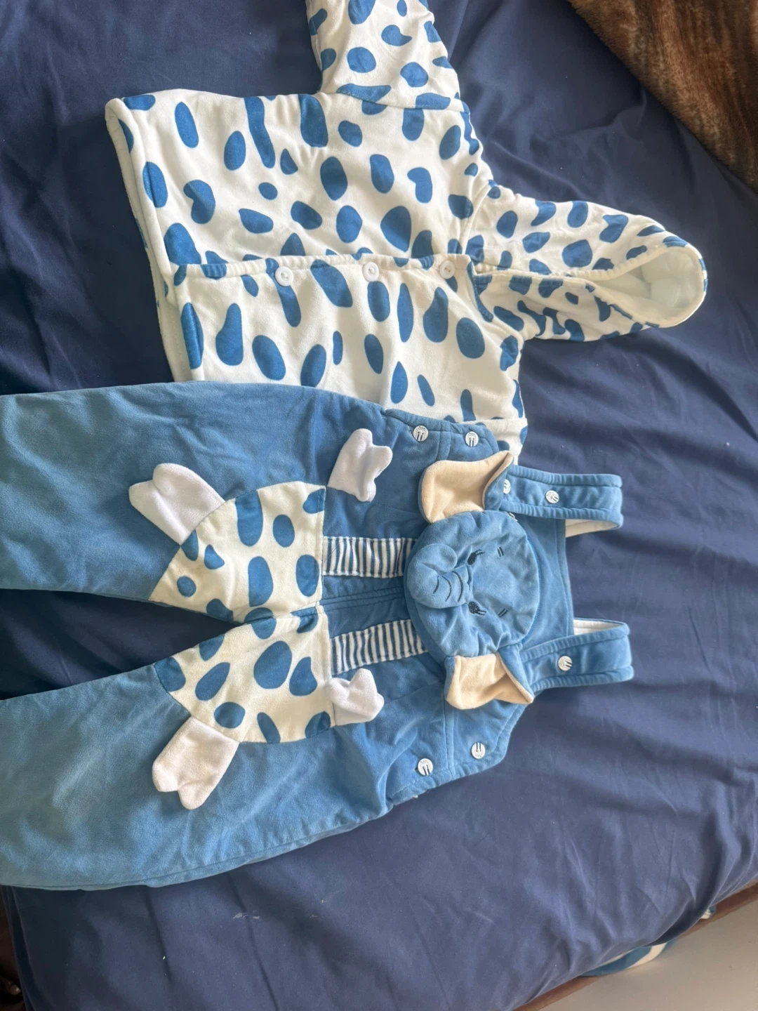 Cute blue overalls with an elephant appliqué and matching hooded jacket with blue polka dots. Soft material for your little one's comfort! Great for keeping warm on chilly days.